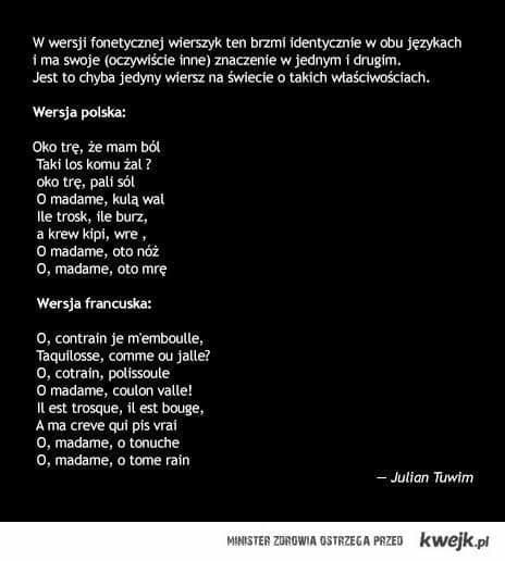 Co gorsza, jak zostałam sprawdzona, to przegrałam. Wierszyka nie napisał Tuwim tylko niejaki Jaworski, a Tuwim to tylko zacytował w książce o żartach językowych – Pegaz dęba na stronie 300. To porażka numer jeden. Porażka numer dwa – a tak, bo jest jeszcze porażka numer dwa: wiersz w wersji francuskiej nic nie znaczy, a napisany jest tylko po części po francusku, a po części za pomocą różnych francuskopodobnych neologizmów.