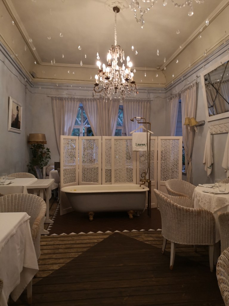 Im Restaurant mit Krankenhausbetten, im Garten mit Villa, im ehemaligen Sanatorium…