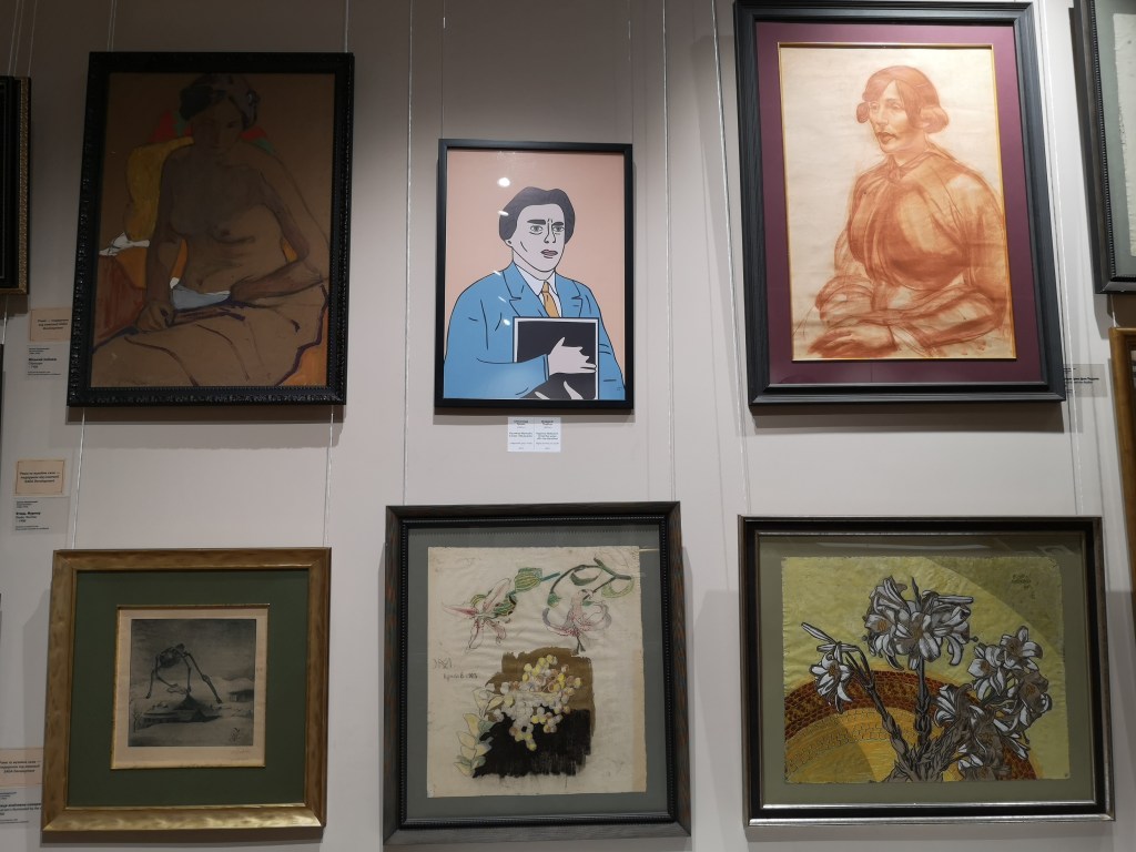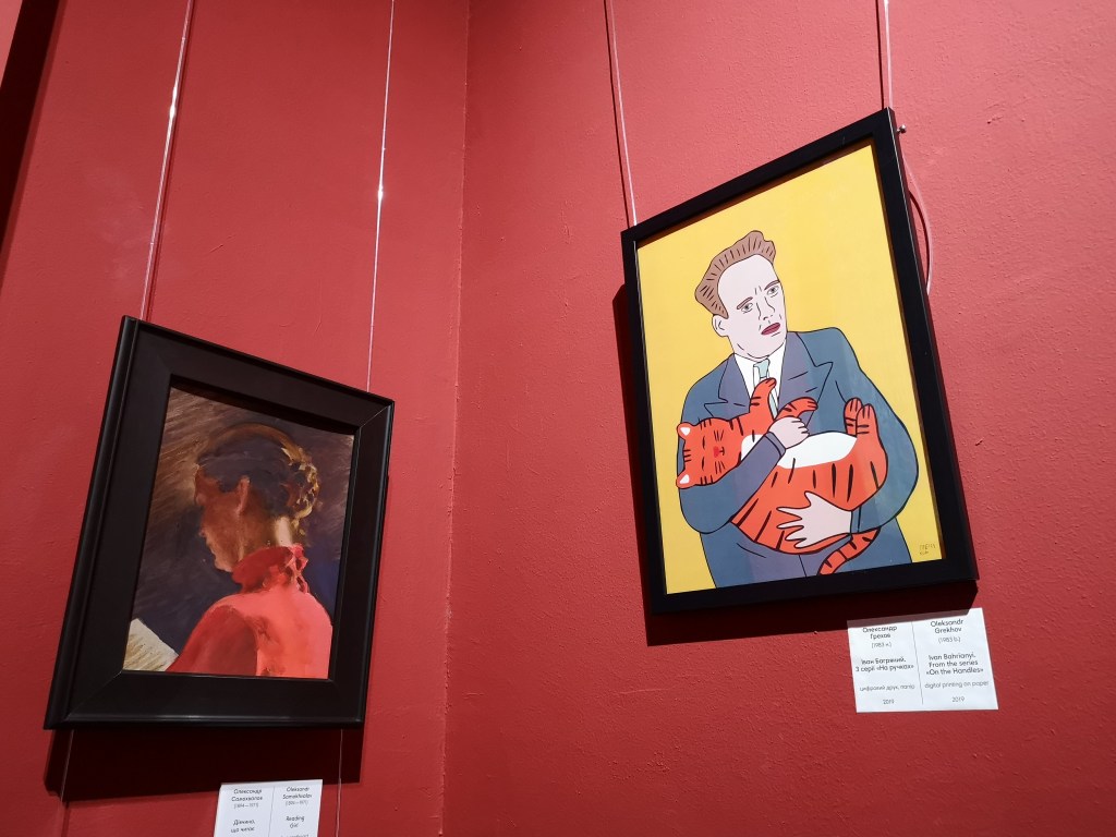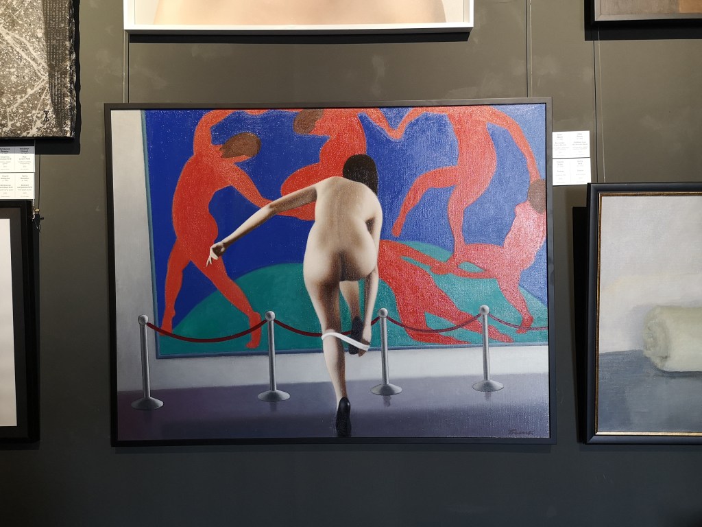 Humor, durch alte ernste, gewichtige Meister neben modernen Grafiken.