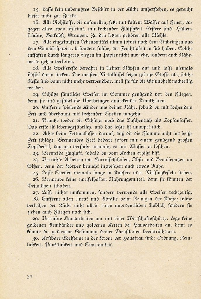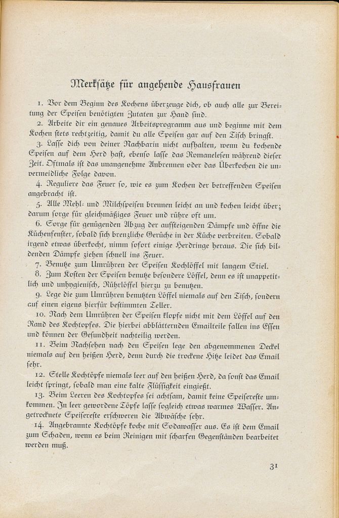 Bei mir fehlt alles. Die anderen Merksätze, wie das ganze Buch in Frakturschrift geschrieben, sind leider auch nichts für mich. Ein Paar würde ich vielleicht akzeptieren: Lasse nichts umkommen, sondern verwende alle Speisen rechtzeitig. Manche sind veraltet, manche unverständlich oder lächerlich: Lasse dich von deiner Nachbarin nicht aufhalten, wenn du kochende Speisen auf dem Herd hast, ebenso lasse das Romanelesen während dieser Zeit. Oftmals ist das unangenehme Anbrennen oder das Überkochen die unvermeidliche Folge davon.