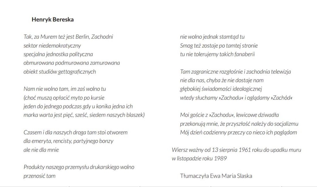 Henryk Bereska (1926-2005), którego wiersz autorki przytaczają w swojej publikacji, był poetą, aforystą i tłumaczem literatury niemieckiej na polski i polskiej na niemiecki. Mieszkał przez 28 lat “za Murem” czyli w Berlinie Wschodnim i ten temat odcisnął głębokie piętno na jego życiu i twórczości i wracał wielokrotnie w jego poezji.