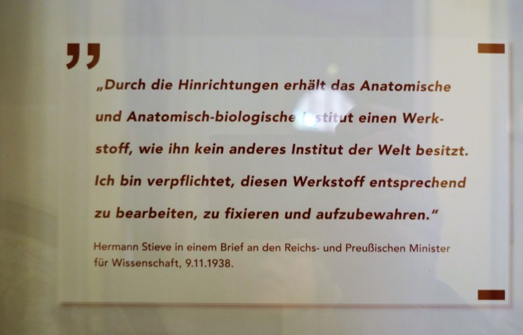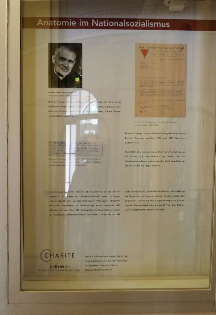 W więzieniu Berlin-Plötzensee podczas nacjonalistycznej dyktatury w latach 1933-1945 zamordowano przez zgilotynowanie lub powieszenie ponad 2800 osób. Większość z nich została następnie poddana sekcji zwłok w Instytucie Anatomicznym i Anatomiczno-Biologicznym Uniwersytetu Berlińskiego dla celów badawczych i dydaktycznych. Ponad 300 powstałych w ten sposób mikroskopijnych preparatów, pochodzących głównie z ciał kobiet, znaleziono w 2016 roku w posiadłości anatoma Hermanna Stieve.