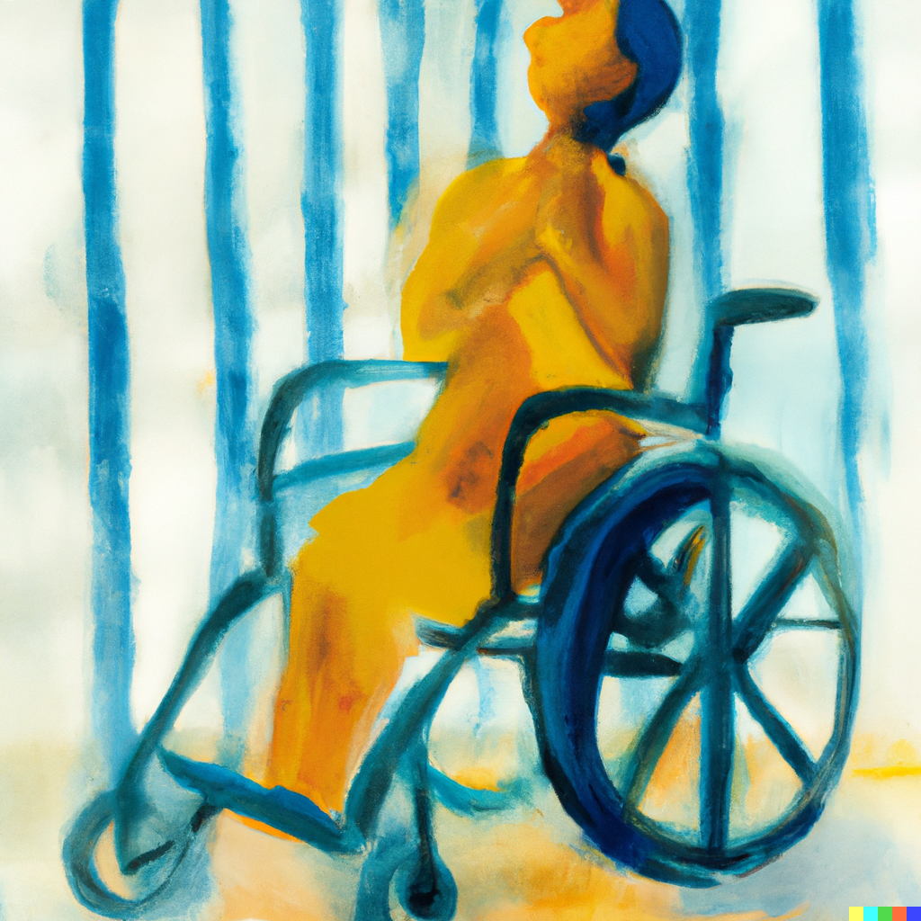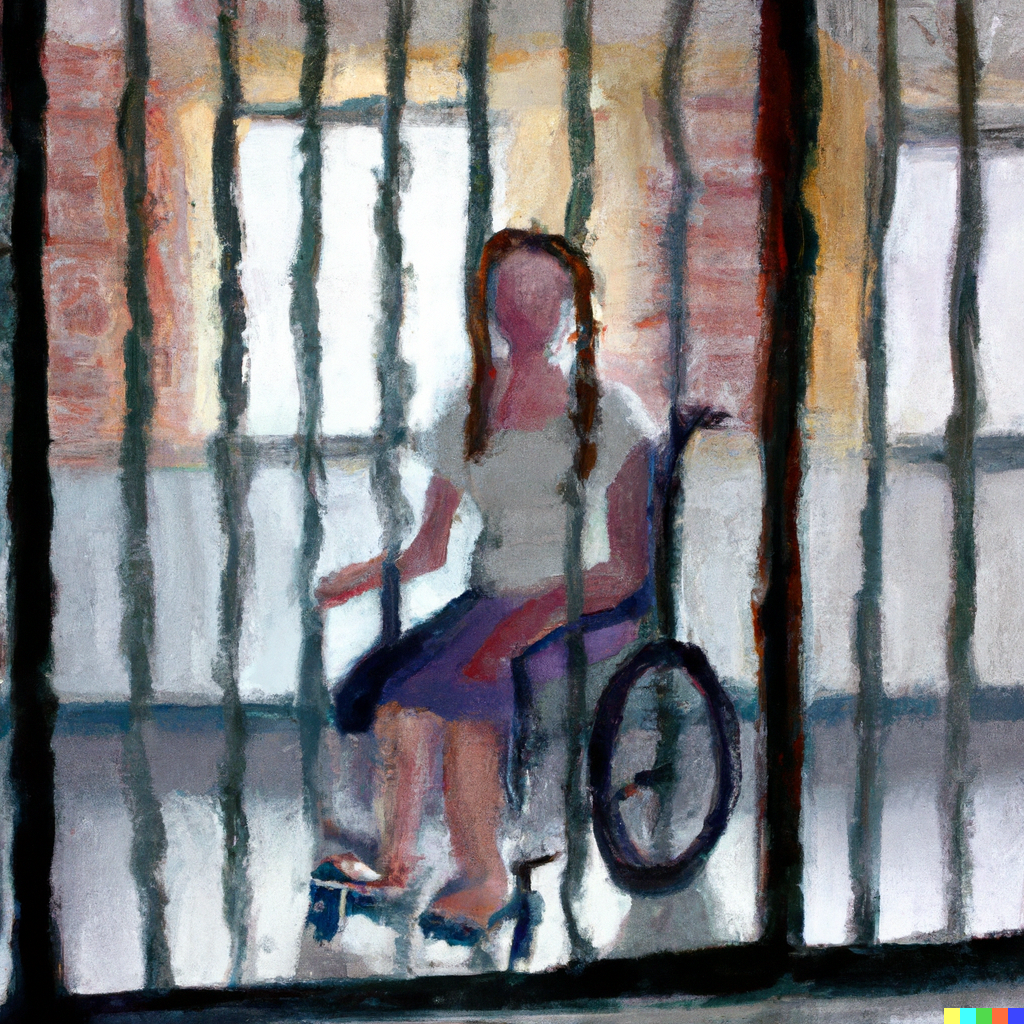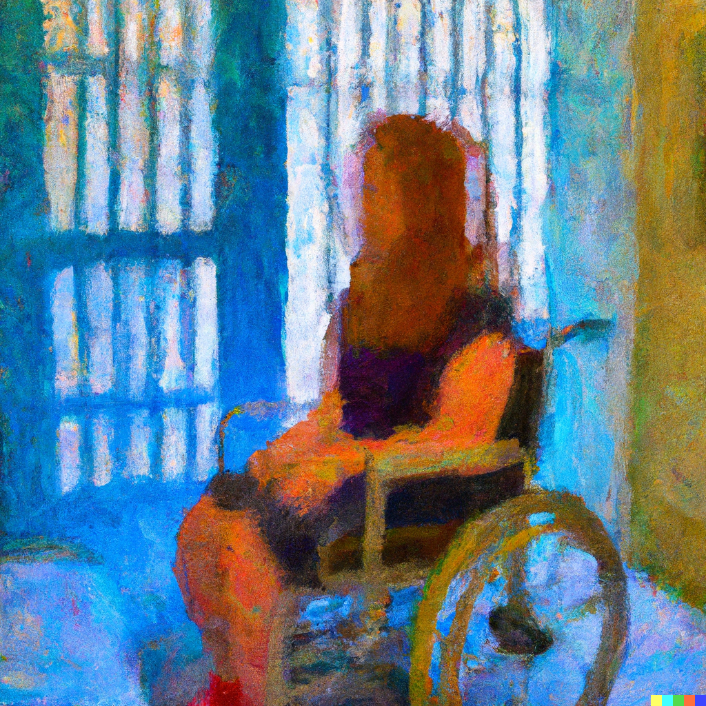 W różnych miejscach na blogu umieszczone zostały obrazy, których wykonanie Konrad zlecił Sztucznej Inteligencji DALL-E. Osoba zlecająca podaje temat, DALL-E w ciągu kilku sekund produkuje dzieła. Jednym z pierwszych tematów, o jakie Konrad poprosił, była Irena Bobowska. Podane przez niego hasła brzmiały: “młoda kobieta”, “wózek inwalidzki”, “więzienie”. Oto, co powstało:
