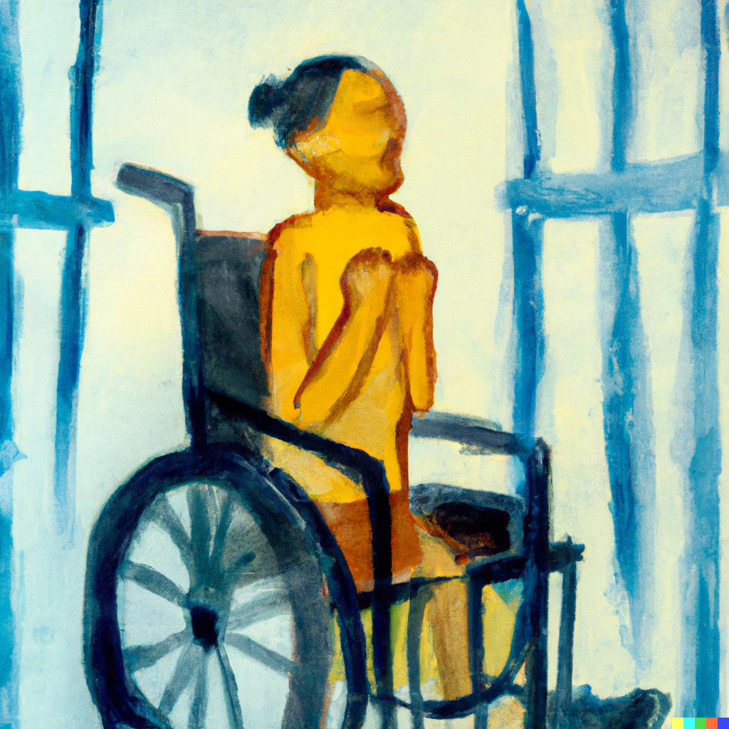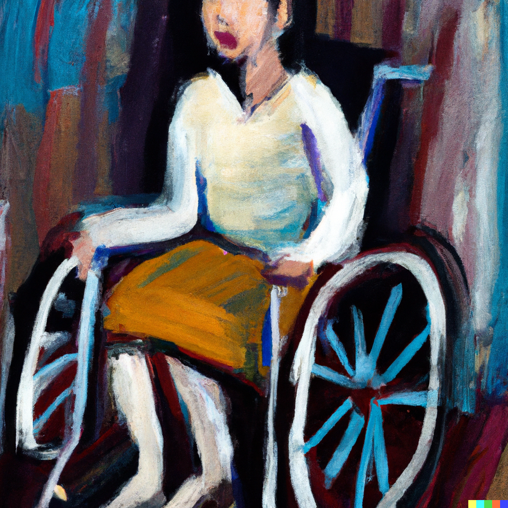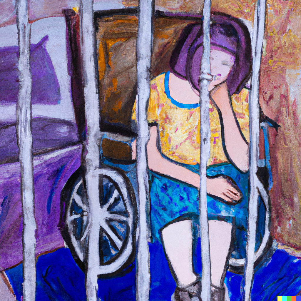 W różnych miejscach na blogu umieszczone zostały obrazy, których wykonanie Konrad zlecił Sztucznej Inteligencji DALL-E. Osoba zlecająca podaje temat, DALL-E w ciągu kilku sekund produkuje dzieła. Jednym z pierwszych tematów, o jakie Konrad poprosił, była Irena Bobowska. Podane przez niego hasła brzmiały: “młoda kobieta”, “wózek inwalidzki”, “więzienie”. Oto, co powstało: