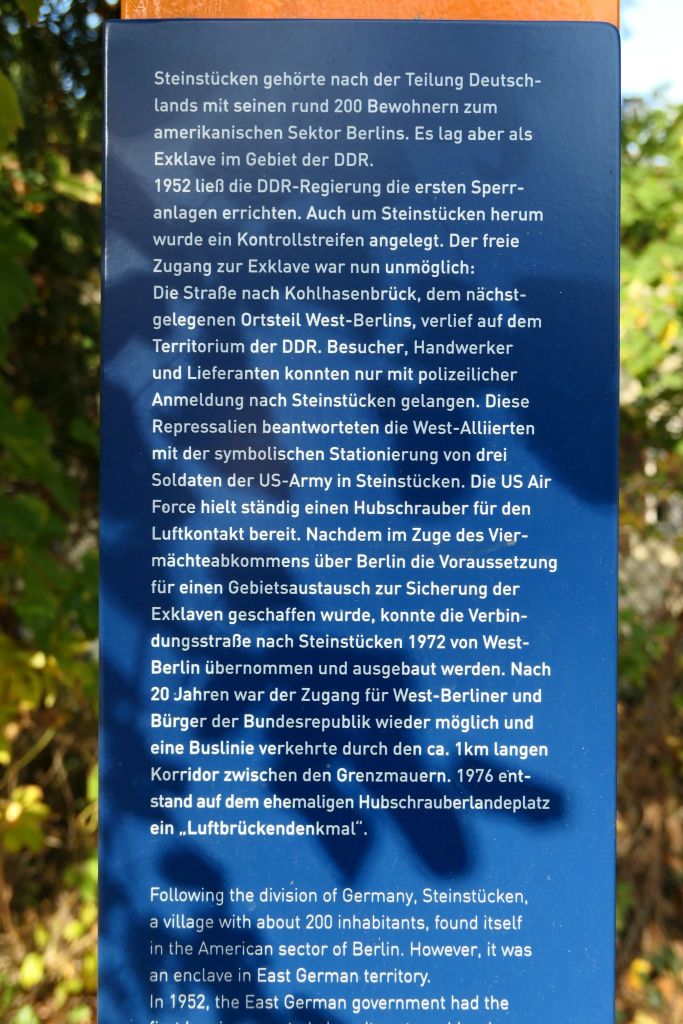 Jeszcze przed upadkiem muru nasz sąsiad zabrał nas na wycieczkę do Steinstücken. Niewiele z tej wycieczki pamiętam, jedynie przejazd przez las, płot z obydwu stron i tory kolejowe, które przecinały Steinstücken. Most nad torami kolejowymi i niebo nad nim stały się częścią Berlina Zachodniego, natomiast przestrzeń powietrzna pod mostem wraz z ziemią pod nim pozostała przy NRD. I tak jest do dzisiaj, most należy do Berlina, a to co pod mostem do Brandenburgii. Choć dzisiaj nie ma to już żadnego znaczenia.