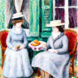 Konrad using the AI-Program DALL-E produced some pictures for the topic Proust and his (no)madeleine… Actually you can say, the program knows exactly what madeleine is (a woman AND a cake) but is ignorant in the question, who is Proust (a man AND a writer). Anyway a wonder!