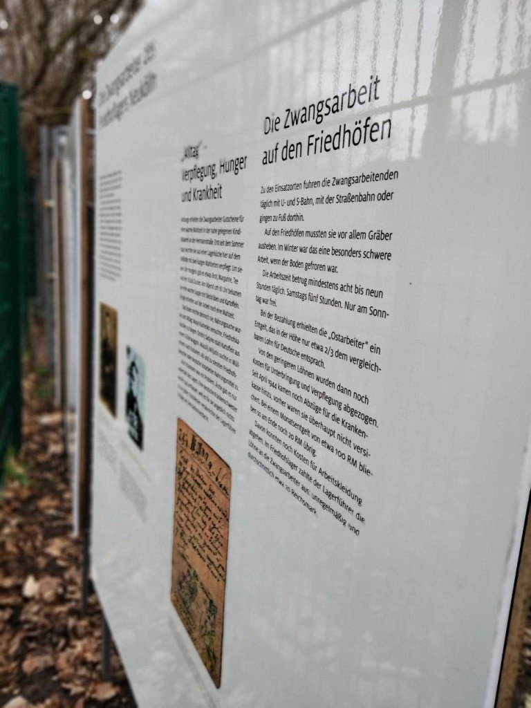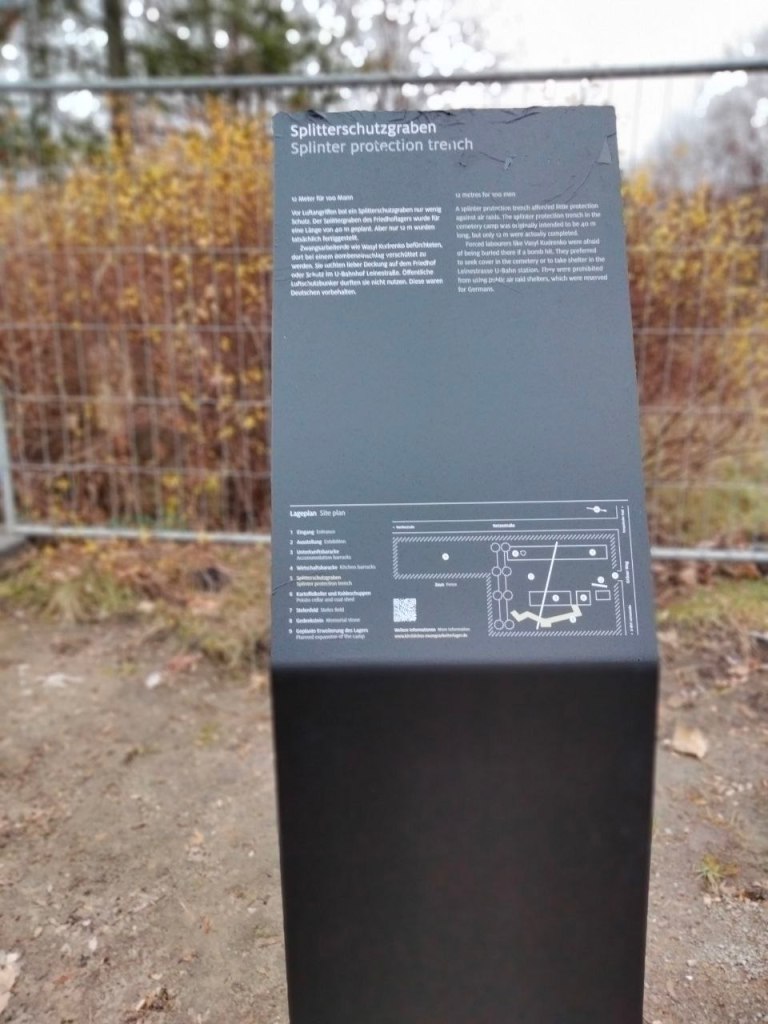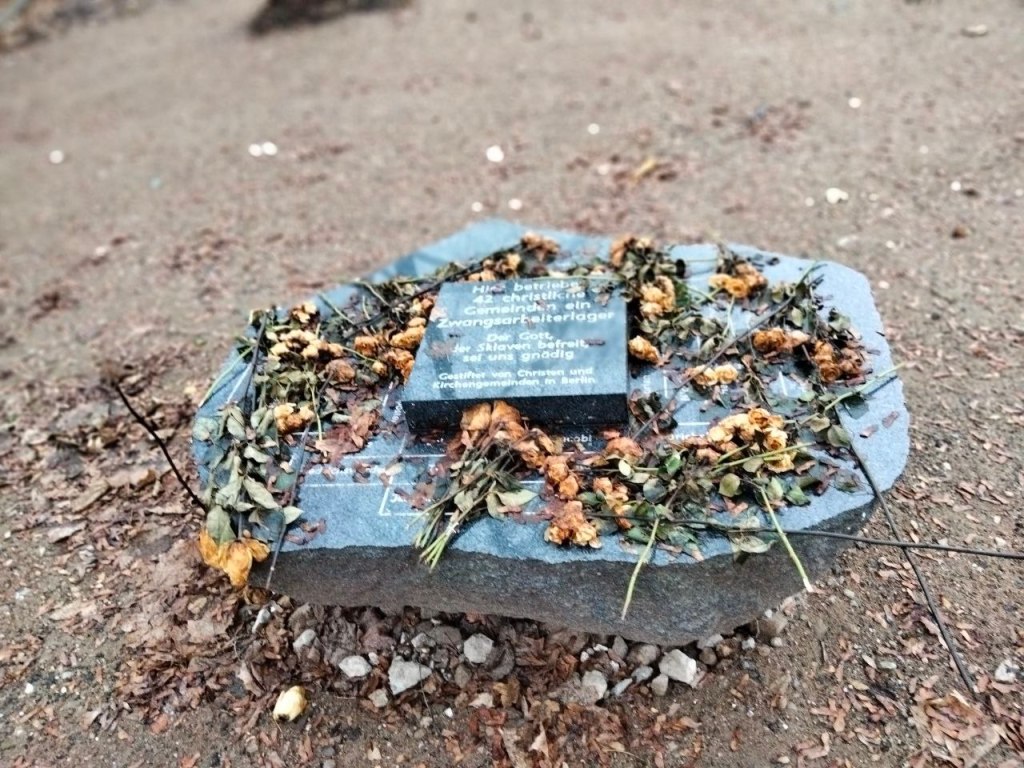 Napis na kamieniu brzmi: Tu 42 parafie chrześcijańskie prowadziły obóz pracy przymusowej. Niech Bóg, który uwalnia niewolników, będzie nam łaskaw. Napis na bramie cmentarnej był podobny: Ku pamięci i przestrodze. Na tym cmentarzu parafie chrześcijańskie prowadziły w latach 1942-1945 obóz pracy przymusowej.