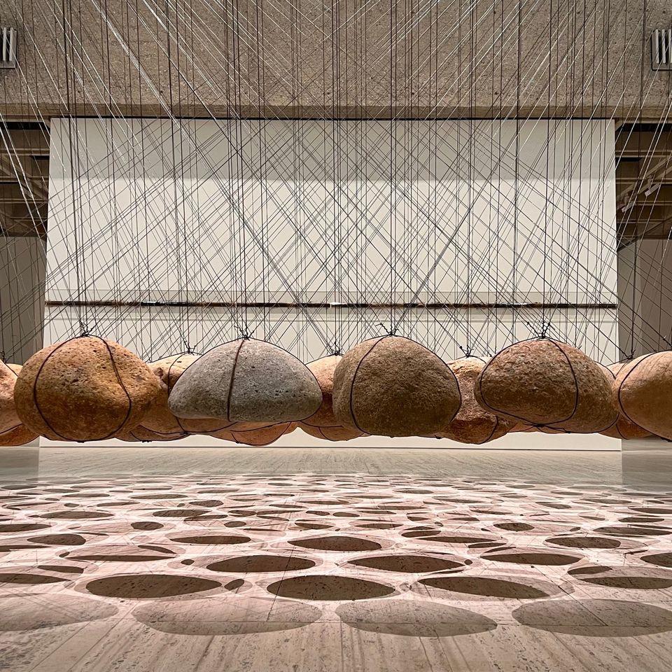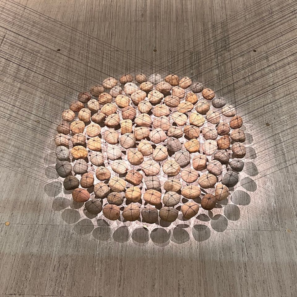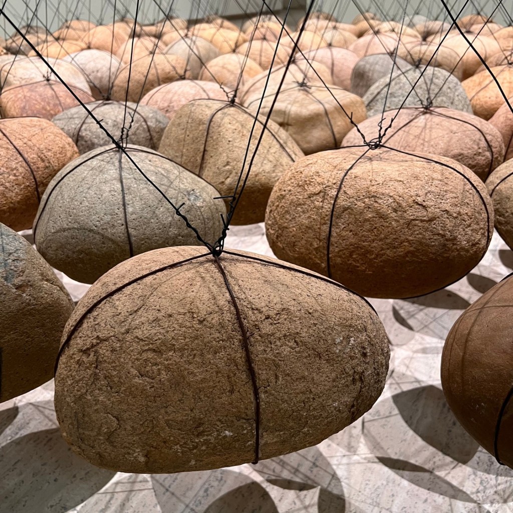 The new installation of Ken Unsworth’s ‘Suspended stone circle II’ brings layered possibilities with every angle: from above and below, find textures of river rock and twisted wire; follow lines of light and tension.
