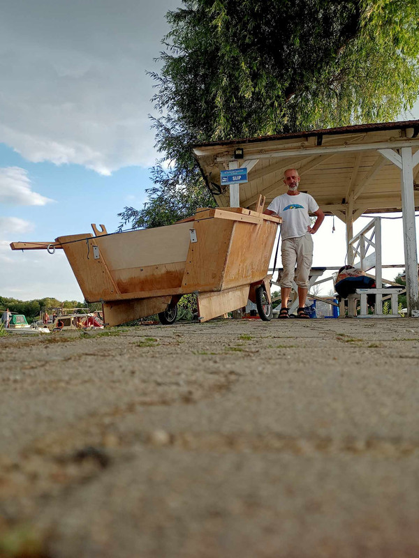 No i siedzę w „Maleńkiej”, wyposażonej w żagiel, wiosła i dwa miecze. Żagiel na nic mi się nie zdaje, bo wiatr wieje prosto w „mordę” . Łódka, a właściwie pół łódki, ma zaledwie dwa i pół metra długości, ale dzielnie się spisuje na falach wywołanych przez wiatr i prujące bez opamiętania motorówki. Wiosłuję twardo. Nawet zgrabnie mi to idzie, ale ile można wiosłować pod wiatr. Widząc moje zmagania, operator śluzy „Redzin” nie bierze opłaty z śluzowanie. Mając silny przeciwny wiatr między ścianami śluzy dwukomorowej o podwójnej długości, ledwo się wydostałem na otwarte wody. Po ponad ośmiu godzinach wiosłowania pod wiatr, dotarłem do portu w Urazie. Jacyś ludzie pomogli mi wyciągnąć łódź na brzeg, bosman zaproponował nocleg w swoim kontenerze oraz sesję zdjęciową z „Maleńką”. Na drugi dzień ruszam wcześnie rano w kierunku portu w Ścinawie do Agaty, Bogdana i ich „Arki”.