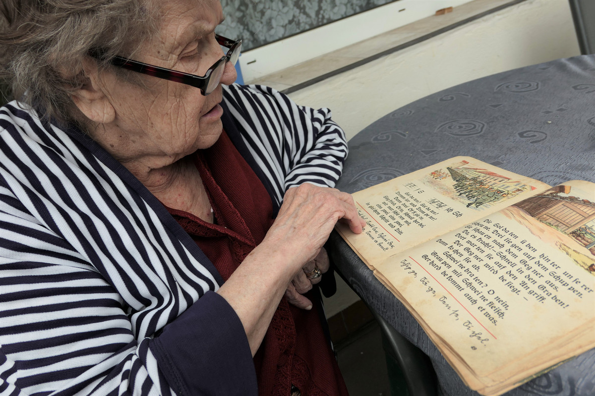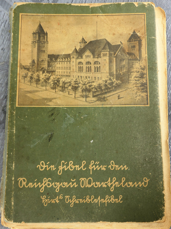 W pierwszej klasie mama uczyła się pisać rysikiem na tabliczce. To było jeszcze w polskiej szkole, w Nowym Tomyślu. W drugiej klasie, w roku 1939, dostała elementarz, który zachował się do dnia dzisiejszego: Die Fibel für den Reichsgau Wartheland Hirt’s Schreiblesefibel. Ferdinand Hirt był prężnym wydawcą. Wydawnictwo działało we Wrocławiu od 1847 roku. W czasie wojny musiało współpracować z reżimem, skoro ukazywały się takie właśnie elementarze z nazistowskimi treściami i ilustracjami.