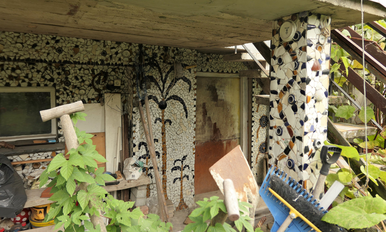 Mieliśmy też naczynia, sztućce, niektóre ze swastyką. Przepadły albo zmieniły właściciela. Oprócz jednej popielniczki wmurowanej w filar podpierający taras naszego poznańskiego domu. Była i jest dla niektórych solą w oku. Dla mojego ojca, twórcy tej niezwykłej mozaiki, żartem poniemieckim, wśród skorup chodzieskiej porcelany.