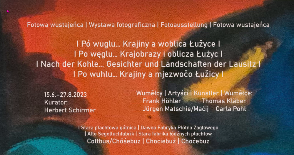 Jeszcze do 27.08.2023 r. w Alte Segeltuchfabrik/ Dawnej Fabryce Płótna Żaglowego w Cottbus/ Chociebużu oglądać można wystawę fotograficzną „Po węglu… Twarze i krajobrazy Łużyc” z pracami Franka Höhlera, Thomasa Kläbera, Jürgena Matschie/ Maćija i Carli Pohl.