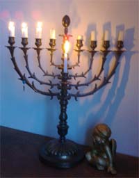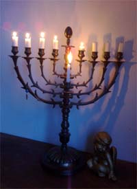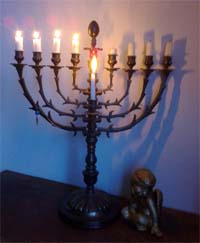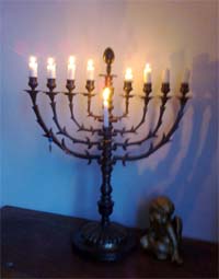 Ilustracje: świecznik chanukowy, tzw. chanukai; codziennie zapalamy o jedną świeczkę więcej, nie używając do tego zapałek, lecz pojedynczej świeczki umieszczonej w osobnym uchwycie, umocowanym w przedniej części świecznika. To mój świecznik, dostałam go od rodziców mojej synowej. Co roku zapalam w nim świeczki, choć wcale nie jestem pobożną Żydówką.