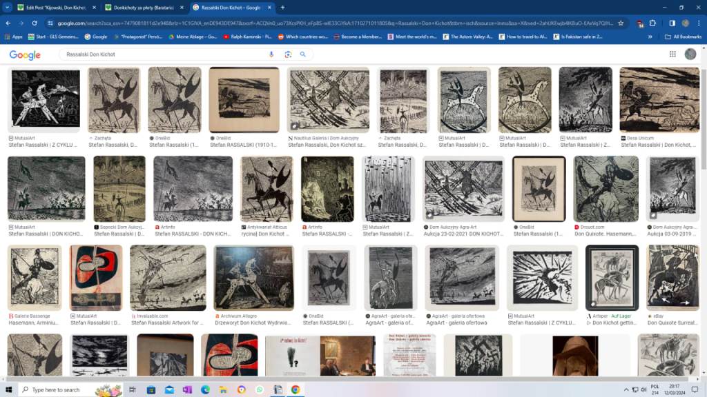 Był już tu na blogu nawet dwukrotnie. Raz we wpisie Z Warszawy nad morze, a raz, z tymi właśnie grafikami, w jednym z wpisów o Baratarii: Don Kichoty za płoty, do roboty, Barataria. A to i znacznie więcej pokazuje google, jak się wpisze: Don Kichot Rassalski.