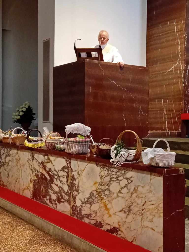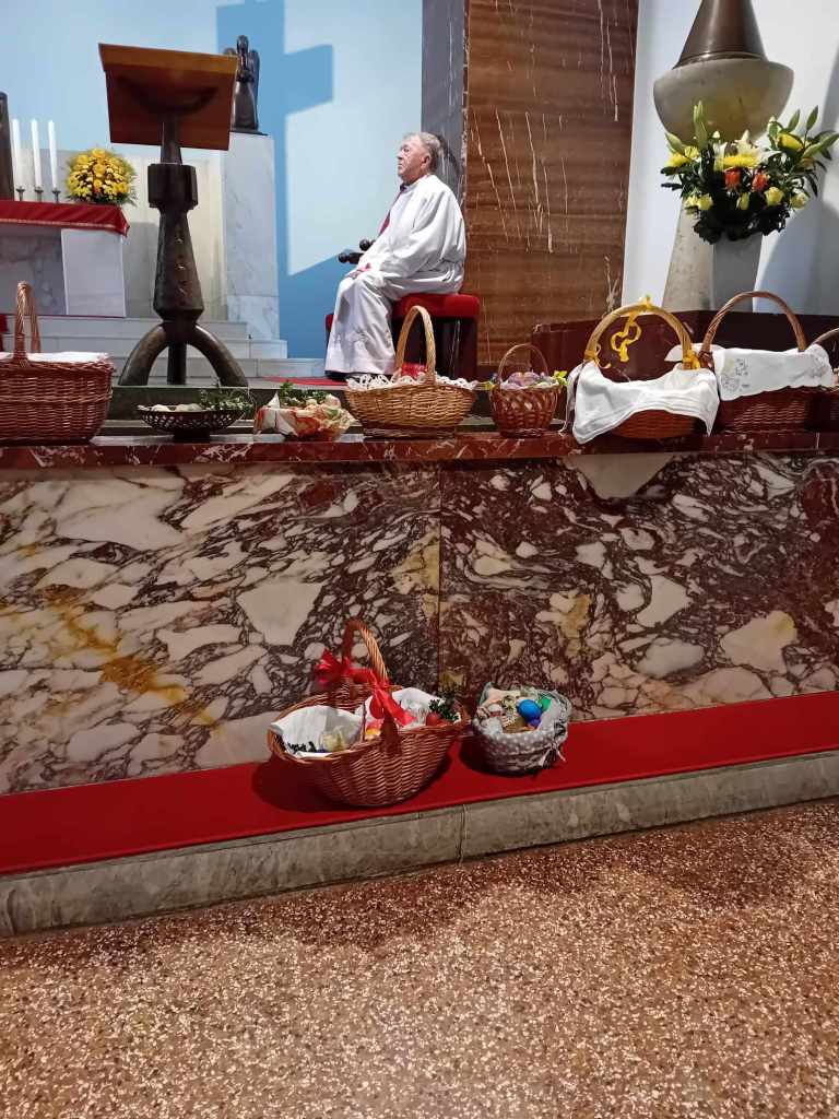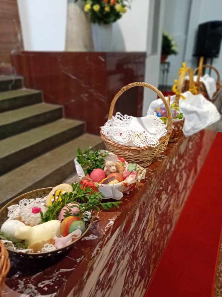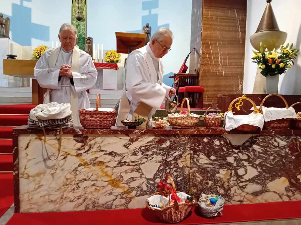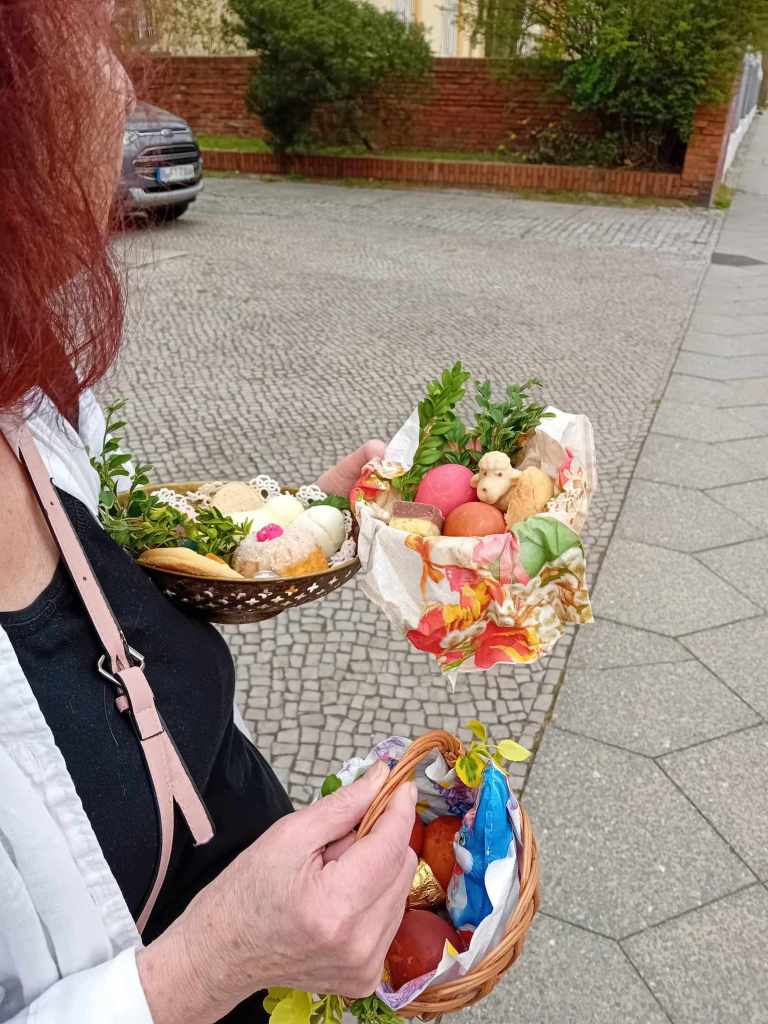 a my tymczasem, czyli Ela Kargol, Anne Schmidt i Izabela Honowska, pojechałyśmy w sobotę do niemieckiego kościoła katolickiego St. Bernhard poświęcić nasze koszyki wielkanocne. To ciekawa sytuacja, bo niemieccy katolicy raczej nie obserwują “święconki”. Ela i ja od kilku lat tam właśnie święcimy koszyki, od czasu, kiedy to podczas pandemii i lockdownu nie można było tego zrobić w polskim kościele na Lilienthalstrasse. A w świętym Bernardzie zadbano o polskich wiernych. Tak to jest!