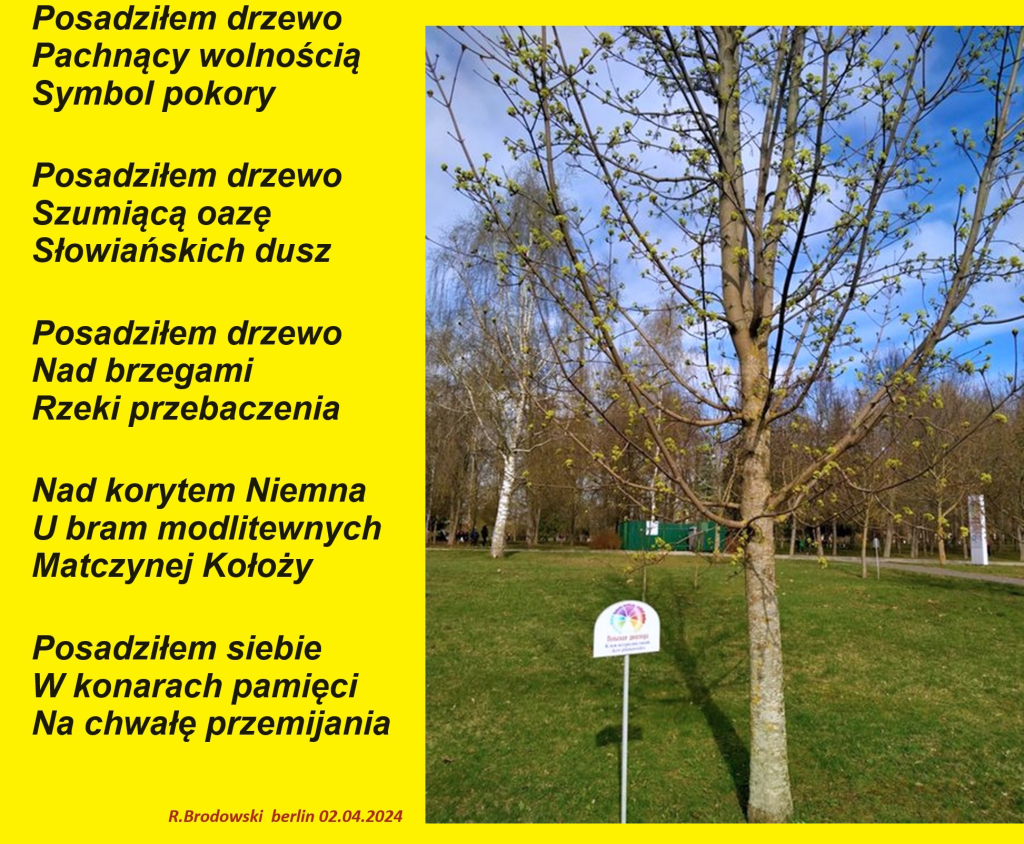 Jakże wielkie było moje zdziwienie, gdy dyrektor departamentu kultury przy Gubernatorze Grodzieńszczyzny, dowiedziawszy się, że w Miedzynarodowym Festiwalu Kultur bierze udział miłośnik Kresów, polski poeta z Berlina (czyli ja), poprosił mnie o reprezentowanie moich żyjących na Białorusi, kultywującym polską kulturę, tradycję, religię, a także język, Rodaków, przez posadzenie w ich imienia symbolicznego drzewa.
