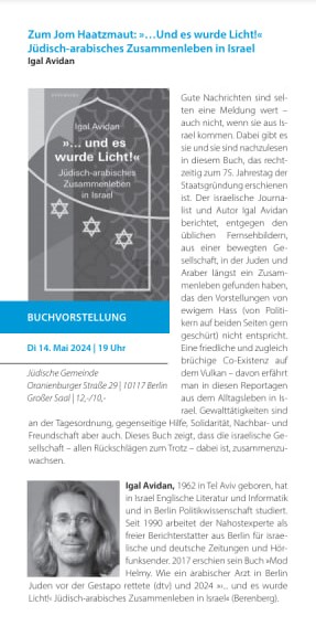 Igal Avidan, 1962 in Tel Aviv geboren, hat in Israel Englische Literatur und Informatik und in Berlin Politikwissenschaft studiert. Seit 1990 arbeitet der Nahostexperte als freier Berichterstatter aus Berlin für israelische und deutsche Zeitungen und Hörfunksender.