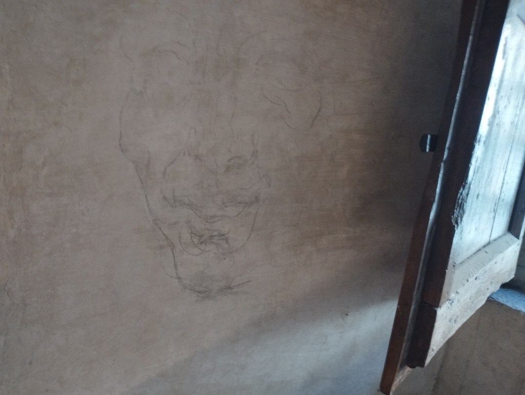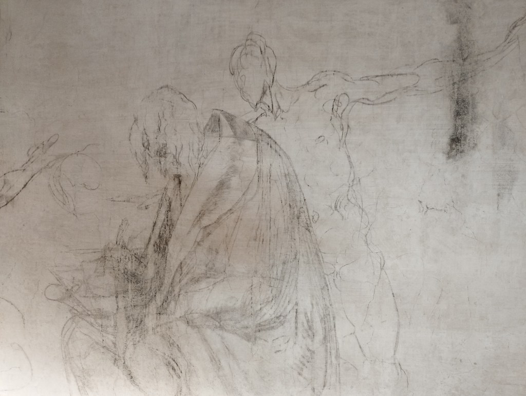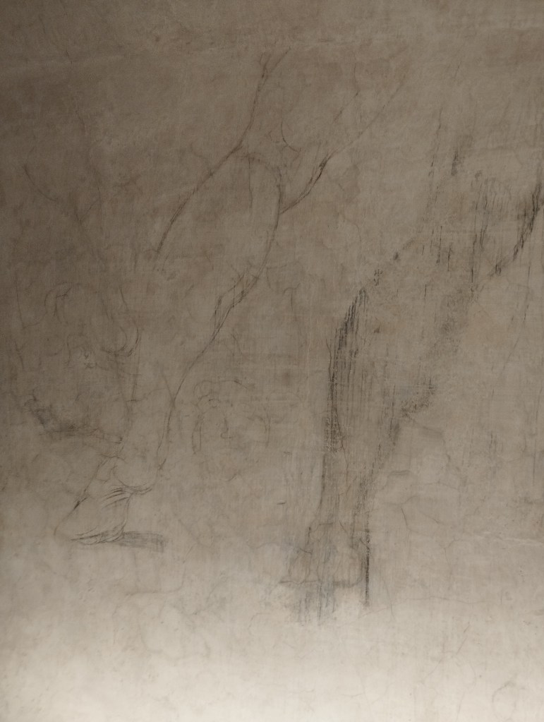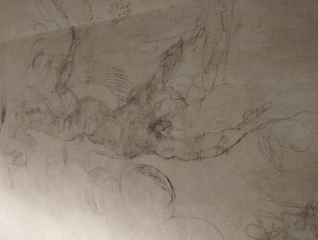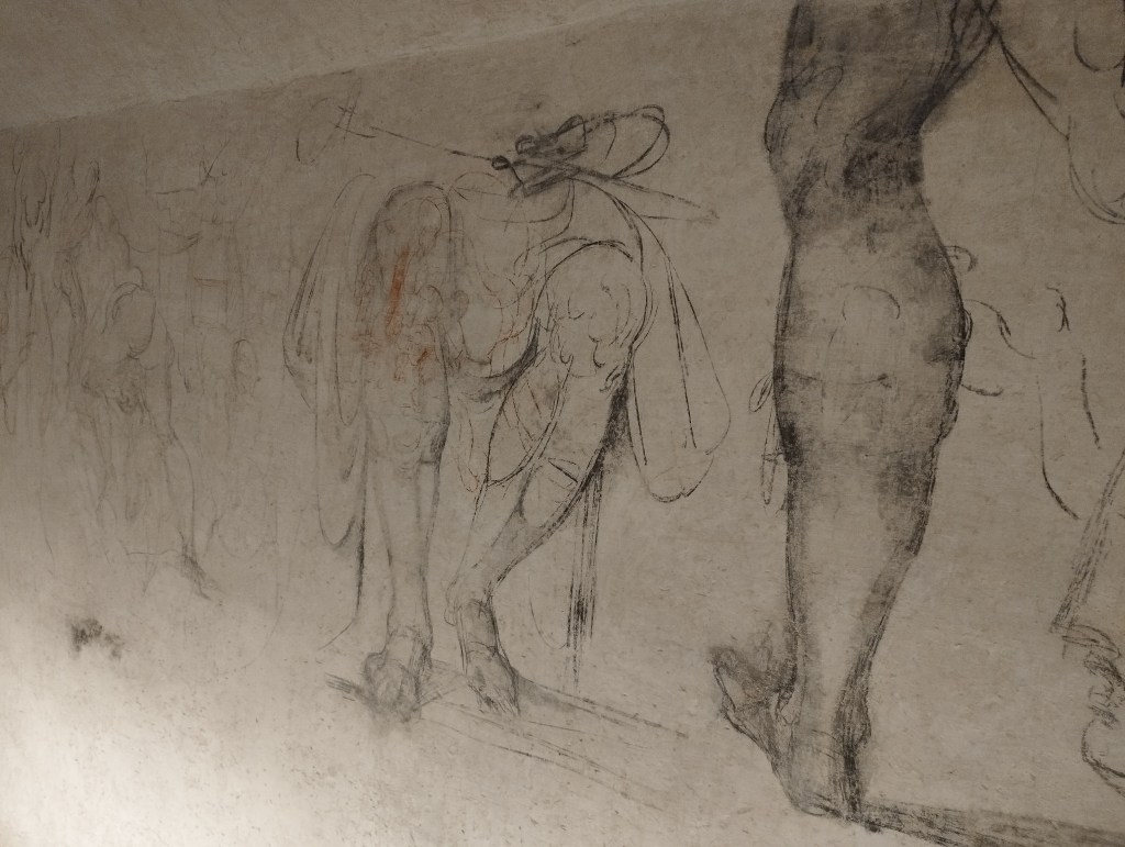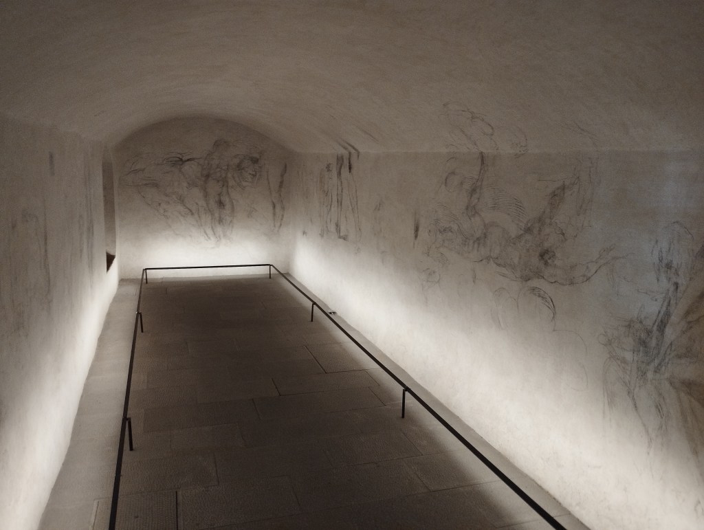 W 1975 r. przeprowadzono próby oczyszczenia wąskiego korytarza pod podłogą nowej zakrystii, wykorzystywanej do 1955 r. jako skład węgla, a następnie nieużytkowanej. Spod dwóch warstw tynku wyłoniły się liczne rysunki ścienne, narysowane węglem. Były różnej wielkości, w wielu przypadkach nałożone na siebie. Ówczesny dyrektor Muzeum, Paolo dal Poggetto, przypisał je w przeważającej mierze Michałowi Aniołowi.