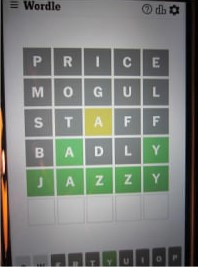 Po każdej próbie NYT zaznacza na czarno litery, które nie występują w docelowym słowie, na