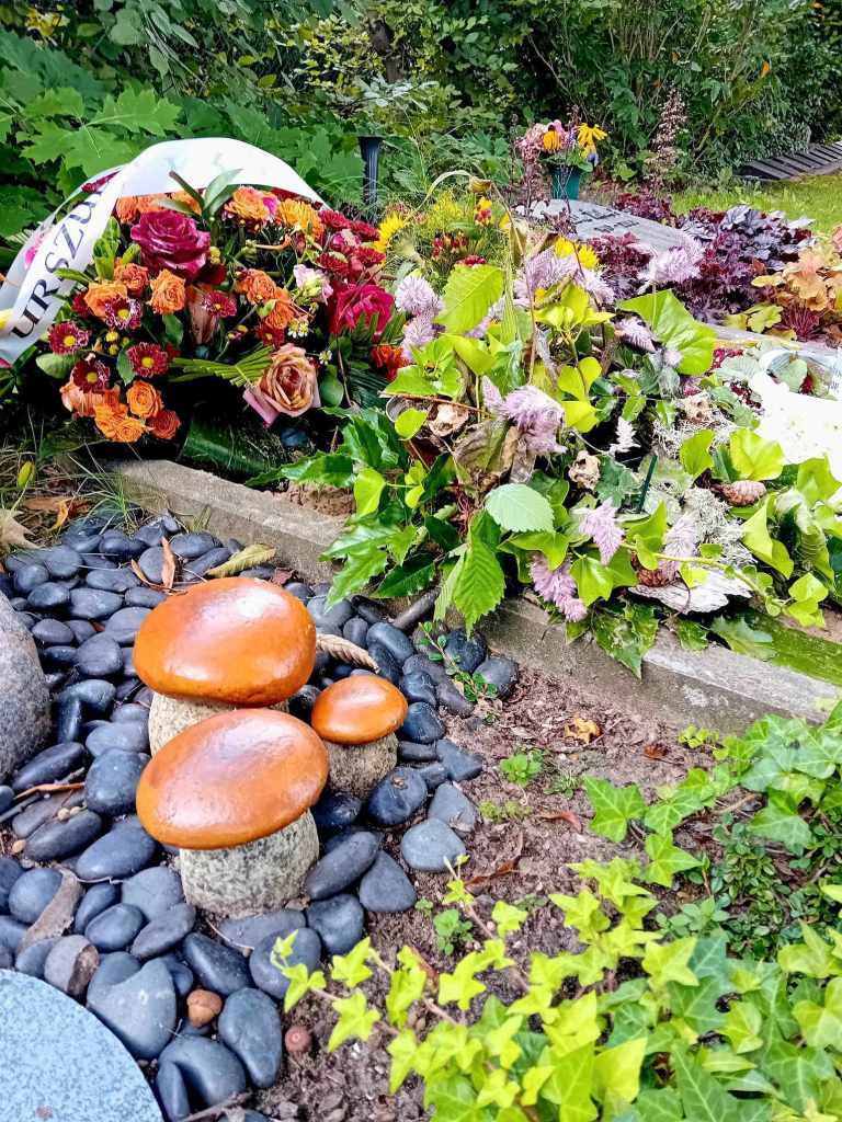 Wystarczy wejść “ogrodową furtką”, trochę w głąb ogrodu, kierować się w stronę kaplicy i anioła. Lewe skrzydło anioła wskaże drogę. Obok grobu Tibora groby wojenne, a u sąsiada na grobie, kamienne grzyby.
