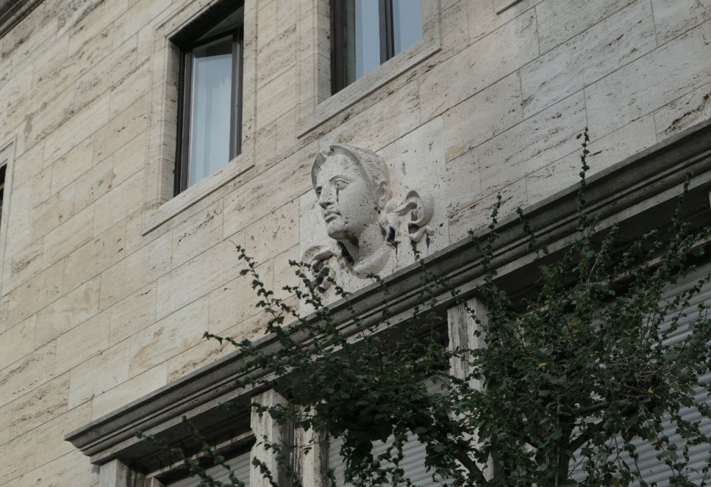 Nad oknami kobieca głowa. Podobno był jeszcze herb Jugosławii. Herbu już nie ma, została głowa. Architektem budynku był Werner March, ten sam, który wraz z bratem projektował berliński stadion olimpijski.