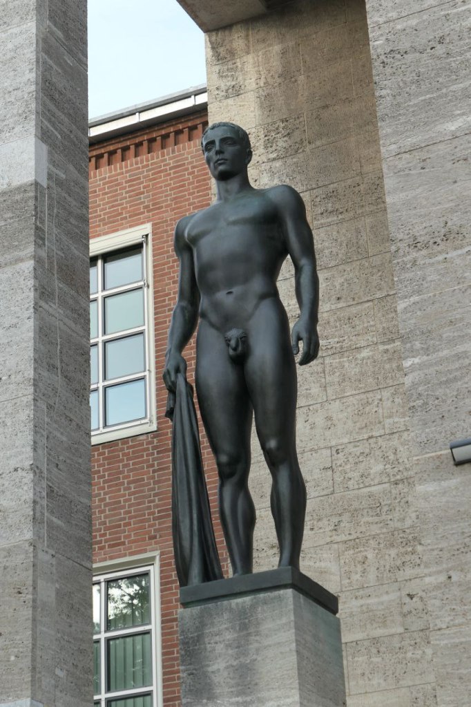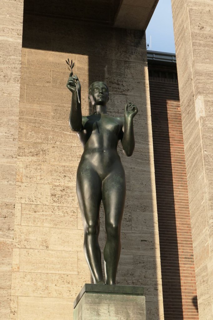 Po lewej stronie między dwoma filarami stoi Dziesięcioboista, a po prawej Zwyciężczyni. Dziesięcioboista trzyma w ręku ręcznik, zwyciężczyni gałązkę laurową. Gdy kilka lat temu oglądałam monumentalne rzeźby wokół stadionu olimpijskiego, plac Jahna, budynki wokół i rzeźby pominęłam.