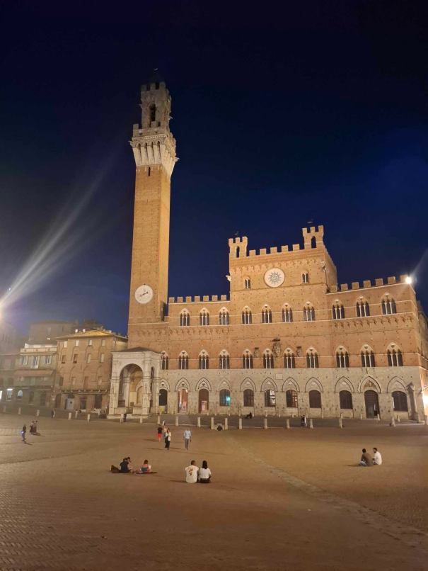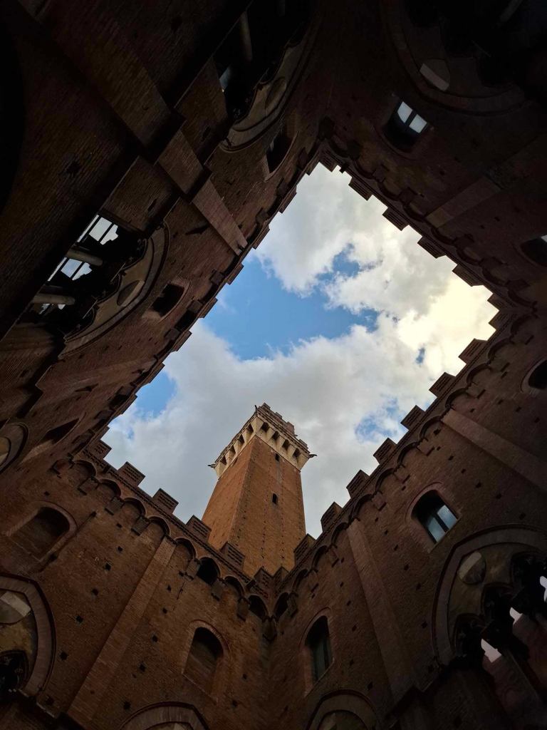 Taką ją sobie Viator wymarzył: potężną, a jednocześnie kameralną, przesiąkniętą tysiącami lat dziejów, całą w ochrach, czerwieniach i oranżach, uwieńczoną strzelistą Torre del Mangia. Taką ją sobie wymarzył, przeczytawszy (nie przeczytawszy: pochłonąwszy!) ongiś Barbarzyńcę w ogrodzie i obejrzawszy setki fotografii. A ona taka właśnie przyjęła Viatora, dopuszczając do większej nawet konfidencji: Torre del Mangia, widziana z perspektywy dziedzińca Palazzo Pubblico, naprawdę zaskakuje.