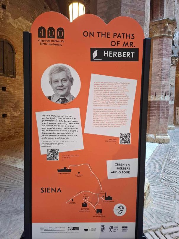 Czytelnicy niewątpliwie zauważyli, że opowieść o Carrarze zatytułował Wędrowiec cytatem z Herberta. Nieprzypadkowo, rzecz jasna. Poeta jest tutaj bardzo ważny. To przecież Herbert sugestywnie opisał Sienę na kartach swego Barbarzyńcy. Niewątpliwie zapamiętał miasto do końca życia. A miasto pamięta o nim. Na dziedzińcu Palazzo Pubblico natrafił Viator na taki oto poster: