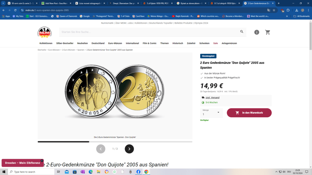 Ela Kargol gab mir vor ein paar Tagen eine spanische 2-Euro Münze mit Don Quijote. Ich habe gedacht, dass es etwas Neues ist, weil ich es nie gesehen habe, aber von wegen. Es ist eine 2-Euro-Gedenkmünze herausgegeben vor fast 20 Jahren! Sie wurde am 30. Juni 2005 im Umlauf gebracht, zum 400. Jahrestag der ersten Ausgabe Miguel de Cervantes’ Don Quixote. Auflage (der Münze) 8 Millionen.