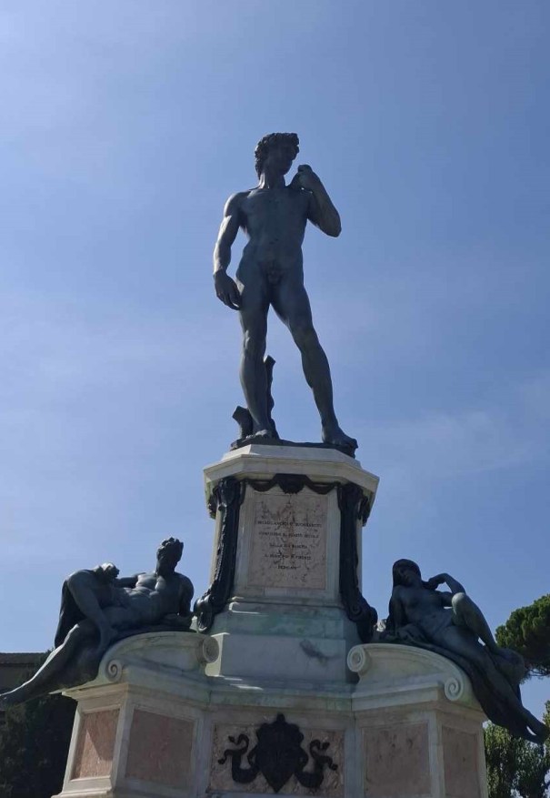Niemniej efeb ów prezentuje swe męskie walory dodatkowo w co najmniej dwóch innych florenckich lokalizacjach (niewykluczone, że jest ich więcej, ale Viator do nich nie dotarł). Prezentuje wielkoformatowo, bo o drobnicy zalegającej we wszystkich sklepach pamiątkarskich Starego Miasta wspominać nie warto. Gdzie prezentuje? Na Piazzale Michelangelo (skąd rozciąga się sławna panorama miasta) oraz na Piazza della Signoria, zdobiąc wejście do Palazzo Vecchio.