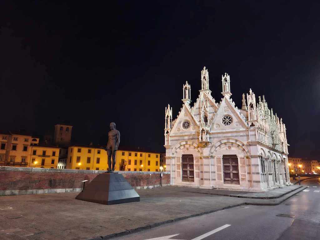 Przed Santa Maria della Spina stoi posąg. Mówiąc ściśle: trudno powiedzieć, czy jeszcze stoi. We wrześniu stał, ale „w ramach” wystawy czasowej, projektu czy też happeningu artystycznego. Więcej rzeźb tego samego autora ustawiono wówczas w różnych punktach Pizy.