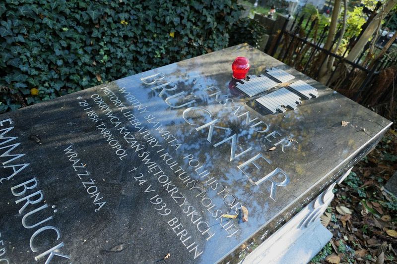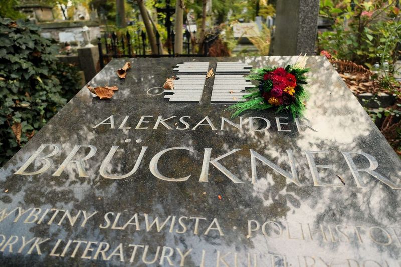 Płyta nagrobna pochylona z motywami Kazań Świętokrzyskich, odnalezionych i opracowanych przez Brücknera. Cytaty po obu stronach płyty i prosta w swoim przekazie i formie płaskorzeźba u góry płyty ma przypominać odnalezione przez Brücknera pergaminowe paski pociętych kazań świętokrzyskich.