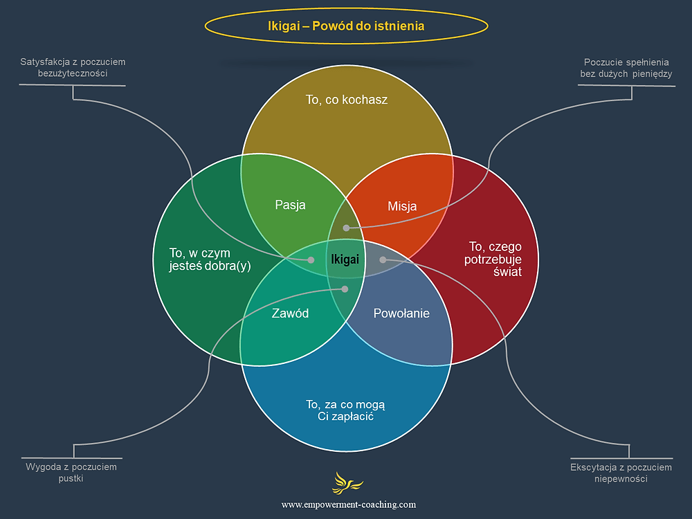 IKIGAI (Japanisch), das Ziel unseres Leben, der Quell unserer Lebensfreude, der Grund, wofür wir morgens aufstehen, wofür es sich zu leben lohnt (cel naszego życia, źródło radości życia, powód, dla którego rano wstajemy i dlaczego opłaca się żyć).