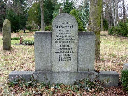Gdy ktoś został na nagrobku zapisany jako “Janek Niedźwiedziński”, pisany zdrobniale Janek, i to ktoś, kto umarł w roku 1925 i to akurat 14 lutego (czyli dokładnie sto lat temu!), to był na pewno Polakiem i to świadomym swej polskości, jeśli na użytek życia i śmierci w Berlinie nie uprościł nazwiska lub mu go nie uproszczono posthum. Ba, nawet jego żona, rodowita Niemka, która potem po raz drugi wyszła za mąż za Niemca, pojawi się na wspólnej płycie nagrobnej jako “verwitw. Niedźwiedzińska” – wdowa po Niedźwiedzińskim.