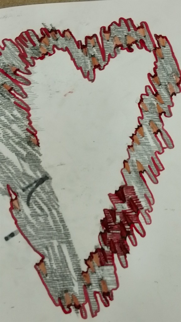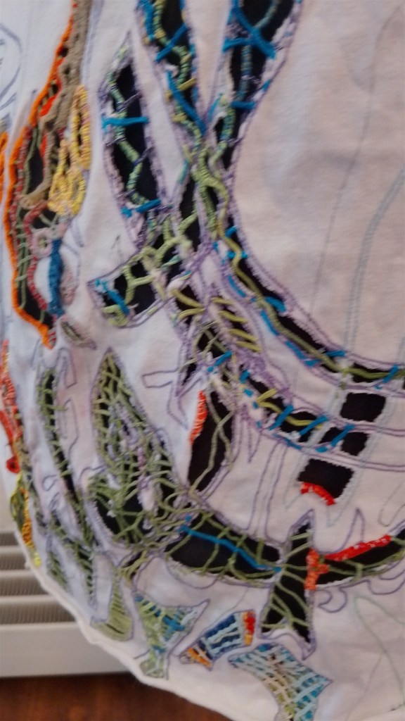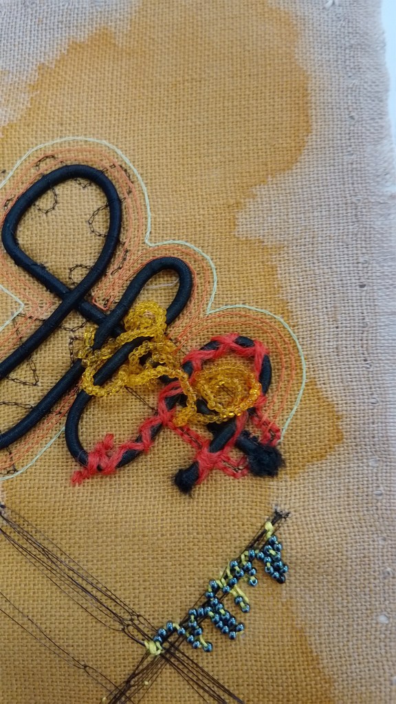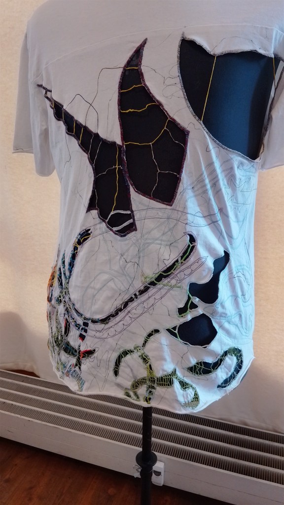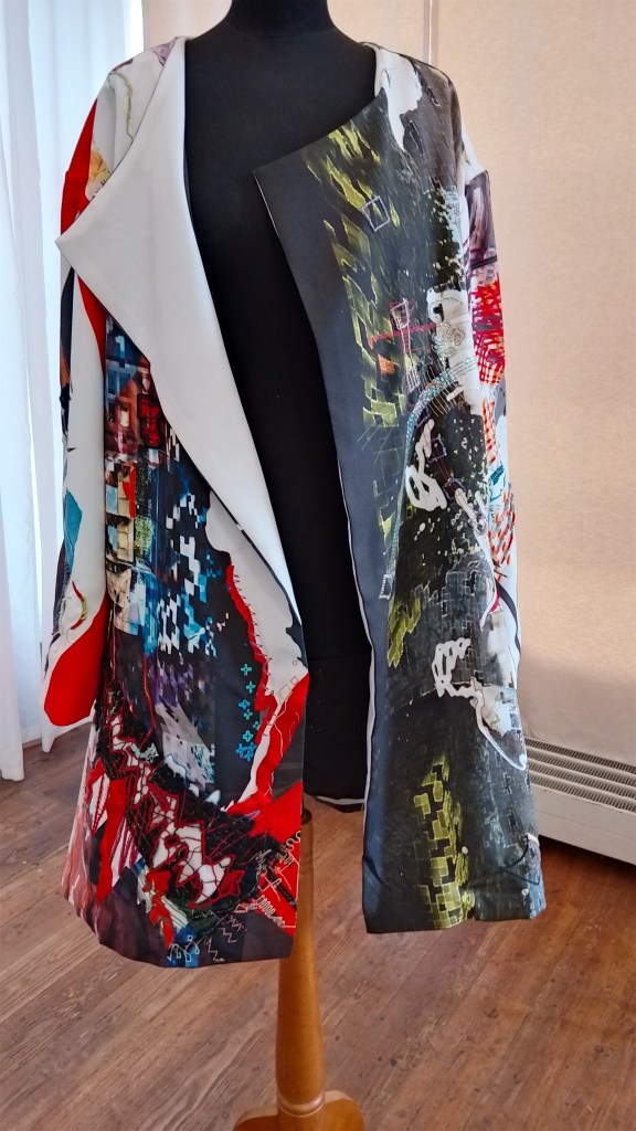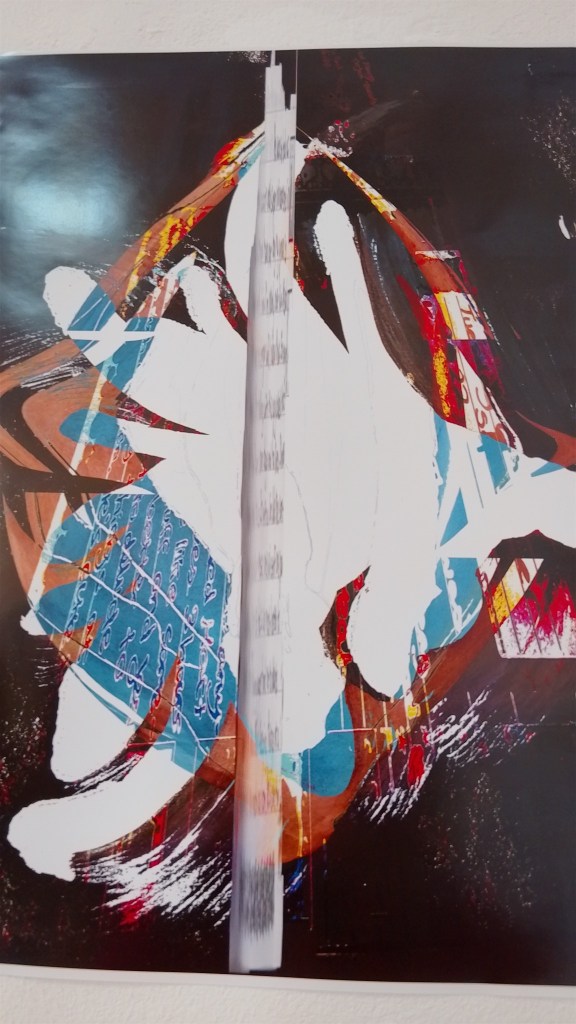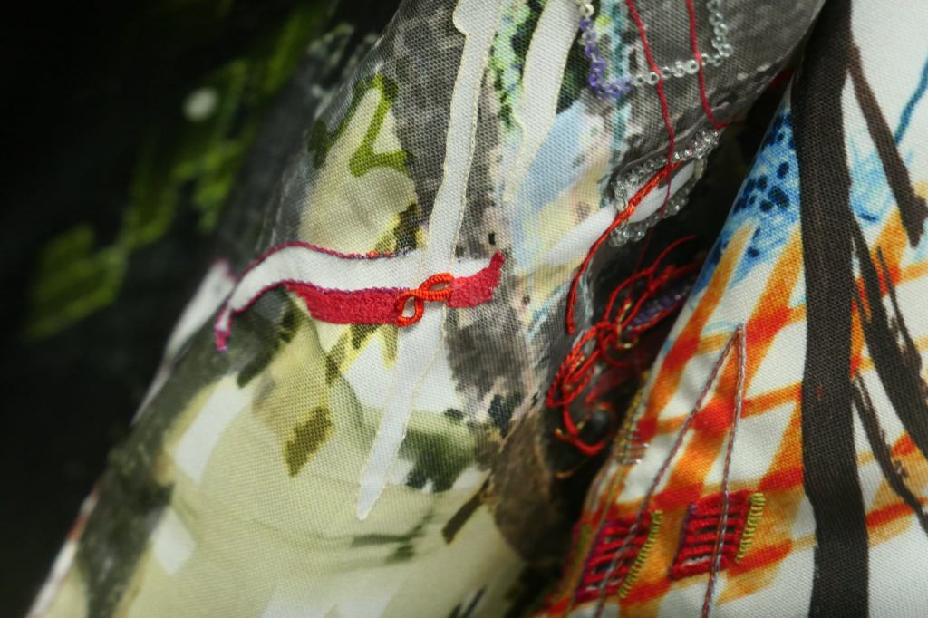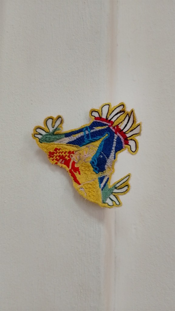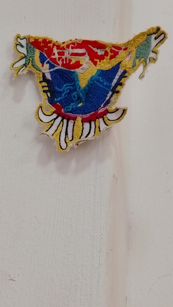 Ela: Każdy odkrywal w pracach Marcelego coś innego. Mnie zachwycił ten mały symbol nieskończoności, zapoczątkowany juz przez Arystotelesa, ta przewrócona ósemka, która nie jest ósemką. Jedna z teorii (wg wikipedii) głosi, że pochodzi od małej litery greckiej omega, która jest metaforą końca i ostateczności. Ten symbol nieskończoności jest wyszty na kolorowym płaszczu / marynarce obok – dla mnie – biało czerwonej flagi, a może tylko obok dwóch przypadkowych kolorów białego i czerwonego.