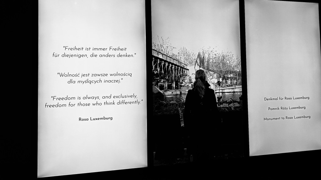 Bardzo szybko dopadła mnie w Berlinie myśl, jakże łatwo w tym mieście nic z jego historii nie widzieć. Nie mam tutaj na myśli oczywiście historii rozumianej jako losów miasta, zaklętych przecież w nierzadkich zabytkach architektury, a historii w sensie jakim ją rozumiem, gdy poznaje nowe miasto, a mianowicie historię spraw, za które, bądź przez które, jego mieszkańcy żegnali się z życiem. Obecne oczywiście są te znane kostki brukowe pamięci, tablice pamięci Märzrevolution na niektórych ulicach wokół centrum, socrealistyczny żołnierz czy dwóch, ofiary muru… Ale, na boga, można odnieść wrażenie, jakoby w pierwszej połowie XX wieku w Berlinie nikt publicznie nie umierał! Oczywiście takie upamiętnienia są, mam tego świadomość, ale mam ją, gdyż wyszukałam to w internecie. Znów, być może po prostu nie chodziłam odpowiednimi uliczkami, nie miałam wystarczającej wiedzy, etc. Mimo to.