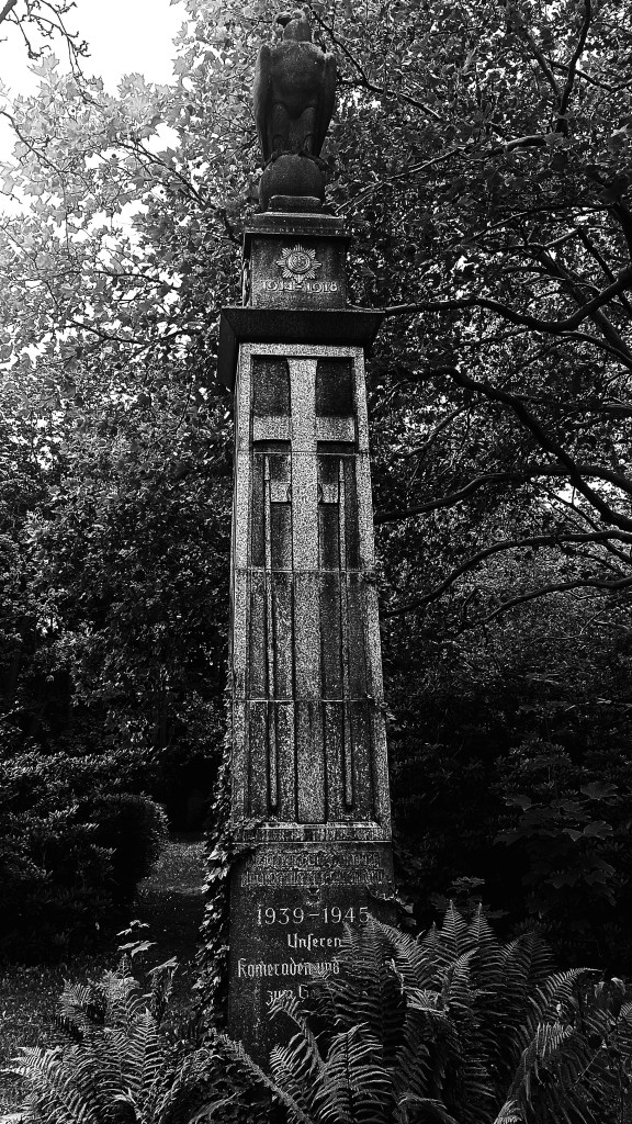 viii. Stoję na rozstaju dróżek cmentarnych. Po prawej i lewej mam alejki grobów z imionami bądź to brzmiącymi z arabska, bądź to nie wiadomo z jakiego, bo zapisanych skryptami bliskowschodnimi, których niestety nie umiem rozczytać. A przed sobą mam na sztorc wyrastającą z ziemi kolumnę uwieńczoną orłem w najlepszej tradycji filmów ze zdobywania Reichskanzlei, upamiętniający żołnierzy niemieckich wojen 1914-1918 i 1939-1945.