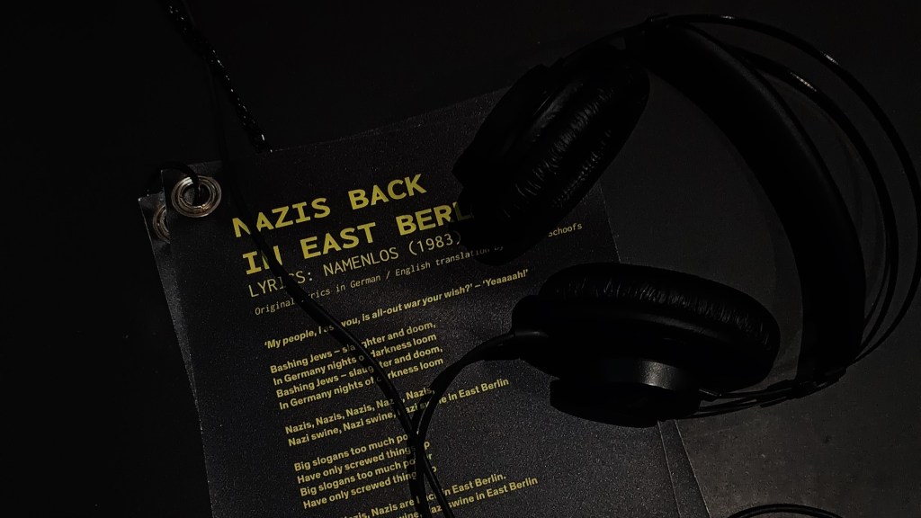 Para słuchawek i wydrukowane tłumaczenie piosenki punkowej „Nazis back in East Berlin”, wystawa „BERLIN GLOBAL” w Humboldt Forum.