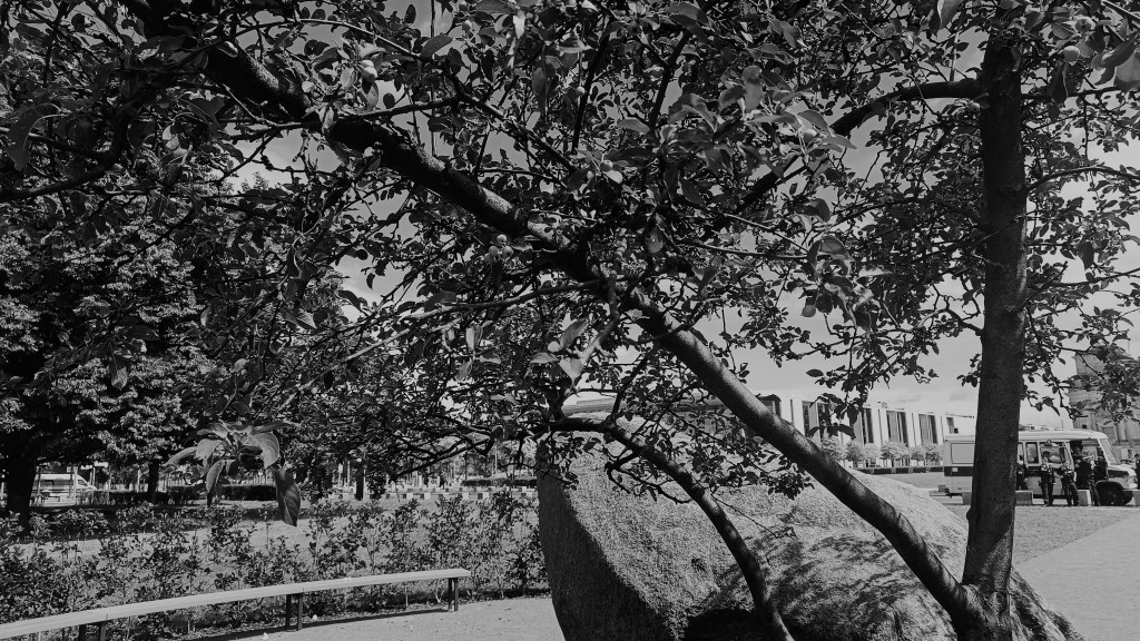 Na pierwszym planie głaz narzutowy „Miejsce Pamięci dla Polski 1939–1945”, aranżacja na terenie po Operze Krolla. Policja na drugim planie w związku z znajdującymi na się na prawo od kadru protestującymi z flagami państwa palestyńskiego i transparentem „IGNORANCE IS A CHOICE”. (wszystkie zdjęcia autorki, lipiec br.)