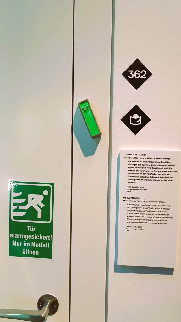 Zielona mezuza zawieszona na framudze przy drzwiach ewakuacyjnych, Jüdisches Museum Berlin.