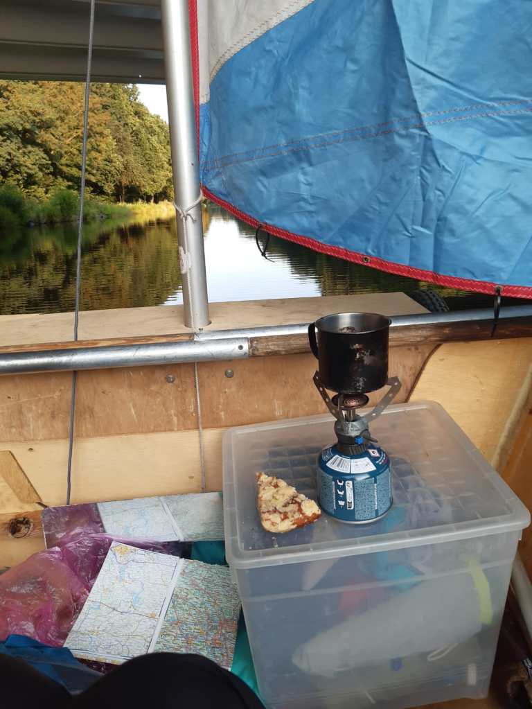 Chyba wziąłem zły przykład. Dam sobie spokój z polityką i zabiorę się do wiosłowania. Zbliża się wieczór, wiatr już zupełnie ucichł. Nie ma co udawać, że płynę na żaglach. A tak mi dobrze szło. Gdy rano zrzuciłem pośpiesznie MAŁĄ MI na wodę za śluzą Wernsdorf, wiedziałem, że do wieczora wiatr zdechnie. Płynęło się wybornie, wiatr z tyłu, ja wygodnie usadowiony na karimacie, nareszcie twarzą do kierunku jazdy (wiosłując siedzę tyłem). Z barki, która płynie w przeciwną stronę pozdrawiają mnie machaniem ręki. W końcu wiatr zelżał, mogłem spokojnie płynąc pod żaglami zaparzyć kawę, posilić się plackiem od Ewy Marii (widać na zdjęciu).