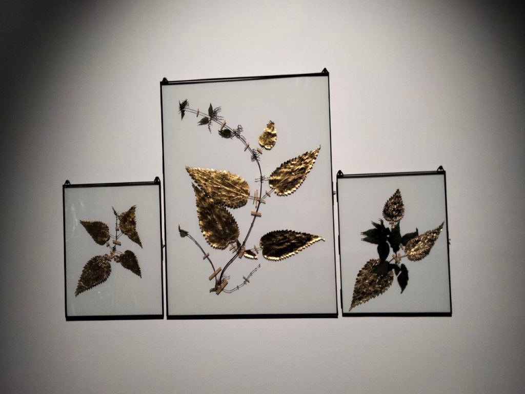 Od góry i od lewej: Natalia Kopytko, Krajobraz II (ceramika), Mira Boczniowicz, Zwoje i całun. Istota życia (len, tkanina, nasiona), Anna Bujak, Korzenie (żeliwo, aluminium, akryl), Dominika Łabądź, Gorąco! (nasiona i ziemia, video), Anna Bujak, Pokrzywy (rrośliny), Karina Marusińska, Obierki (kompozycja na płótnie).