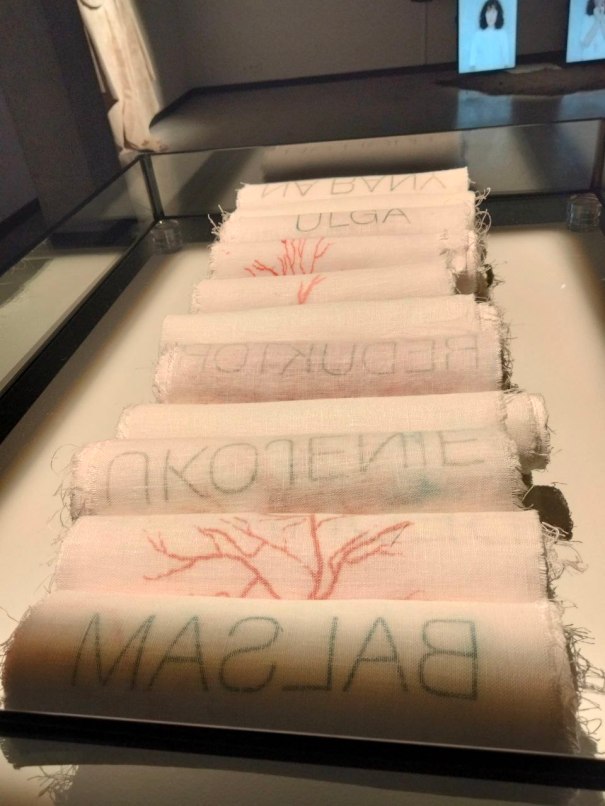 a/ instalacja graficzna – 11 zwoi lnianych ze światłodrukiem, każdy 300 x 21 cm umieszczonych w szklanej gablocie.