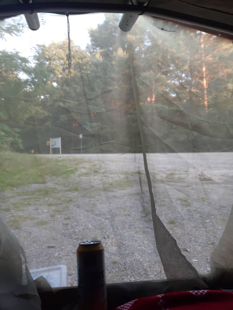 Ruszam dalej, mijam śluzę, po lewej mam jezioro. Na małym placu przy drodze stoi kamper, przed nim przy stoliku dwoje ludzi. Pozdrawiamy się, zostawiam MAŁĄ MI na placu i idę nad jezioro, szukać miejsca na biwak. Nie ma szans, teren ogrodzony. Wracam i wtedy dzwoni żona. Wyjaśniam jej, gdzie jestem i proszę, by spytała ludzi z kampera, czy mogę zatrzymać się obok nich. Chyba ich to rozbawiło, bo od razu beż żadnych podchodów zaczynamy rozmawiać. Dużo podróżują po Europie z kanadyjką a dachu. Częstują mnie puszką jakiegoś napoju energetyzującego. Komary tną niemiłosiernie i w końcu zamykamy się w naszych pojazdach. Z tymi komarami to jest tak, że jak nie mam żadnej ochrony to ich bzyczenie jest bardzo denerwujące, a jak mam moskitierę to grają mi do snu i z tą myślą zasypiam.