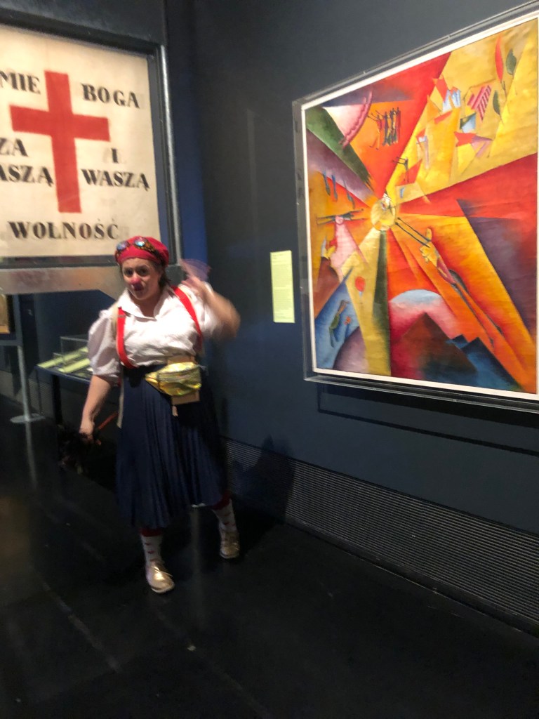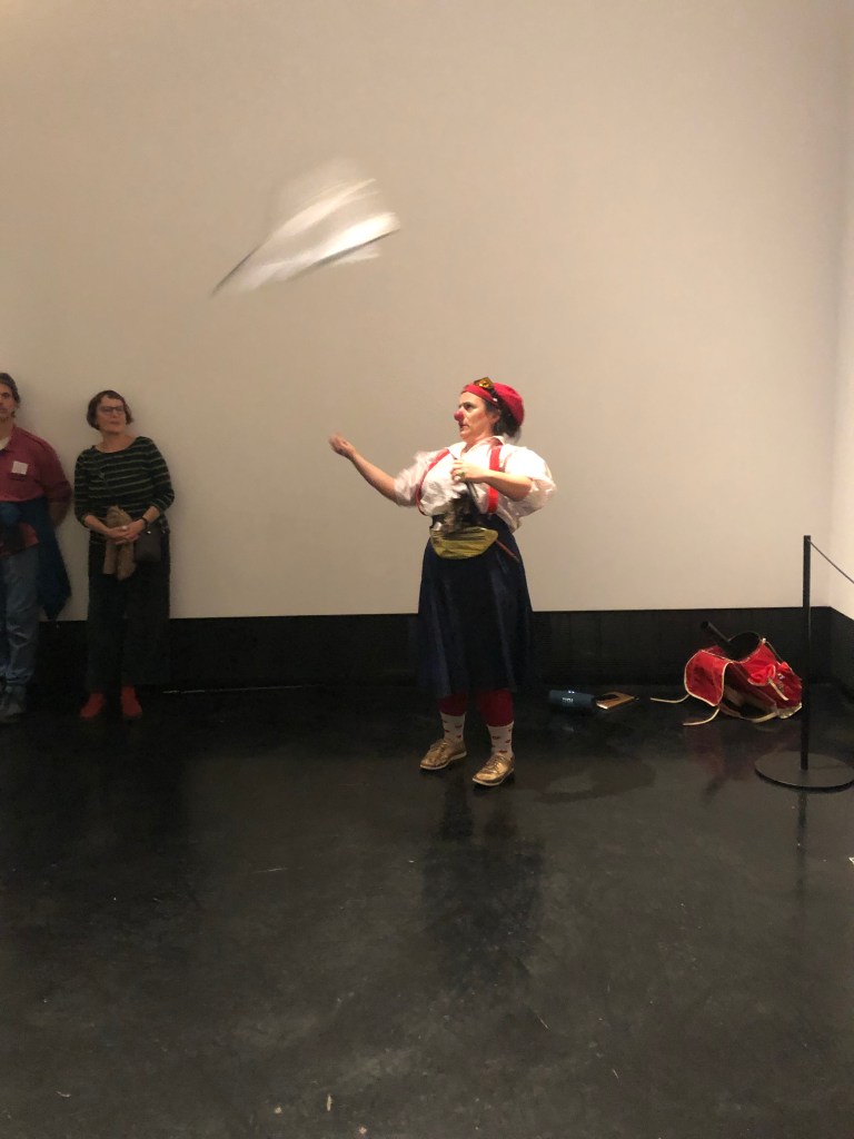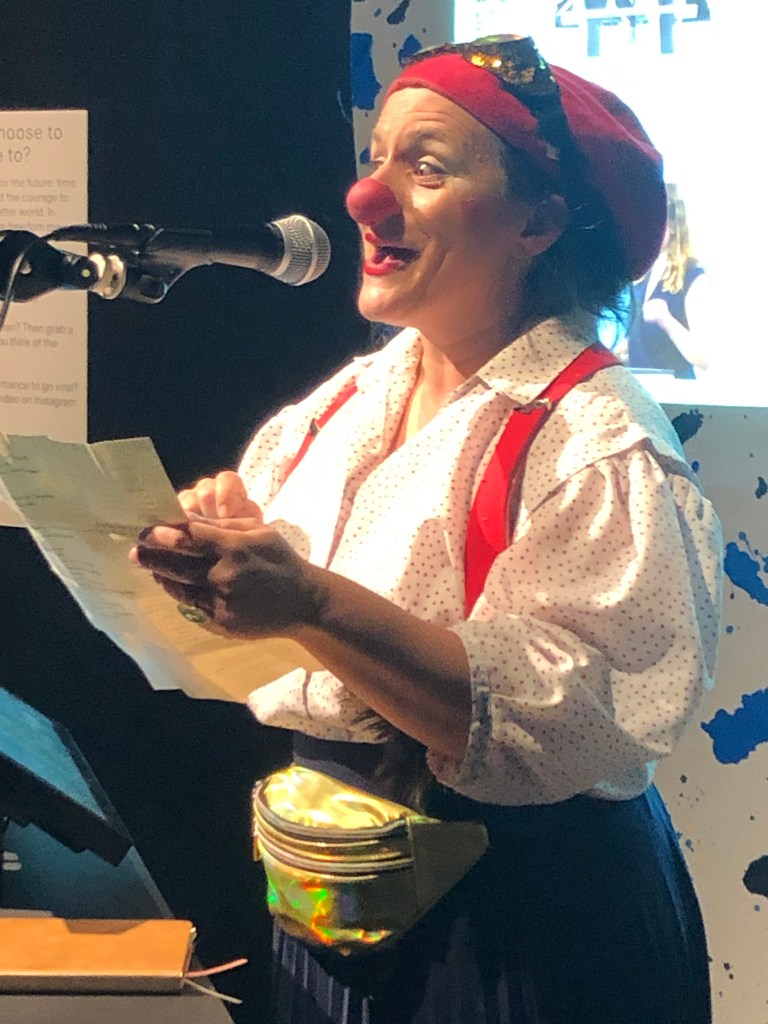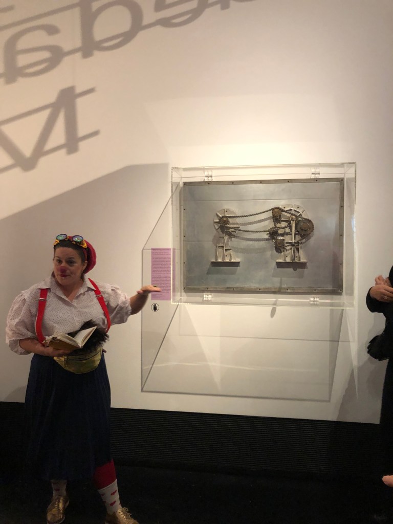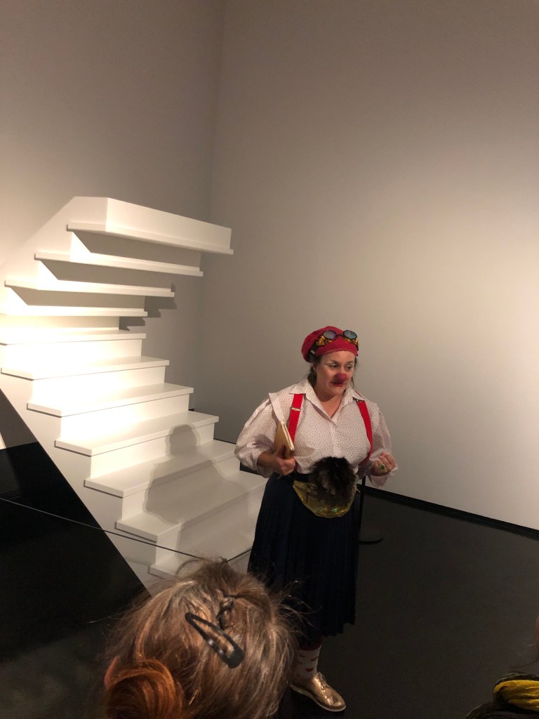Abgesehen davon, dass die Ausstellung sowieso anregend ist, für mich war es das besonders, weil Madame Klimbim, eine Clownin aus Dresden, uns „Kopfüber im Freien Fall“ einen Freiheitsausflug angeboten hat.