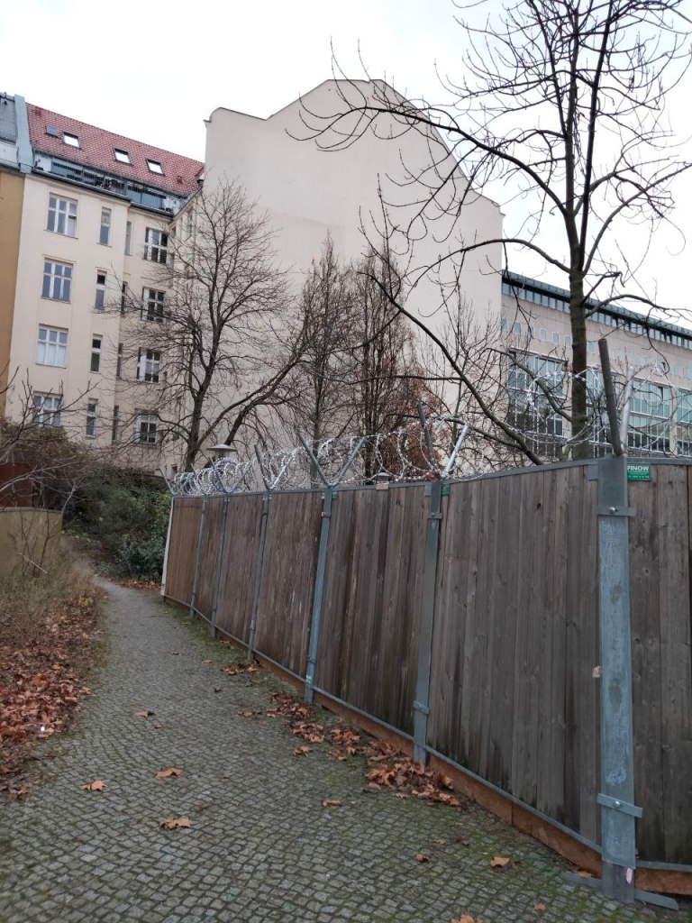 Płot z paneli zwieńczony drutem żyletkowym. To nie jest granica Unii Europejskiej z wrogimi państwami na Wschodzie, gdzie dowozi się ludzi jak broń przeciw NATO, po to żeby ginęli w bagnach Prypeci, to krajobraz w środku miasta. Co tu jest? Skład złota? Złoża uranu? Obóz koncentracyjny?