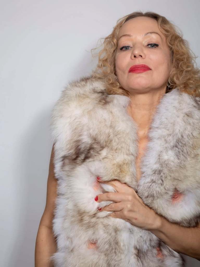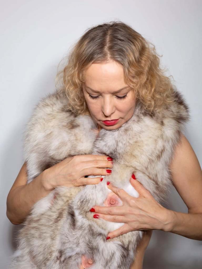 Z takich właśnie nienoszonych już futer szyję stuły. Każda z nich jest zespolona z sutkami układającymi się w dwa ciągi, tak jak to ma miejsce u większości samic ssaków. Sutki na każdej ze stuł pochodzą od innej kobiety. Ta, którą przymierzam została zrobiona z bardzo starego futra z lisów, które dostałam od nieznajomej kobiety na apel w socialmediach. Od tamtej pory dostałam ich sporo od osób, które nie chcą ich już nosić, ale też nie chcą ich po prostu wyrzucić. Przekazanie futer na rzecz sztuki i pokazywanie w świeckich miejscach celebracji jakimi są galerie wydaje się rozwiązaniem idealnym. Odlewy zrobiłam z piersi Ani, która też zgłosiła się w odpowiedzi na moje zapytanie.