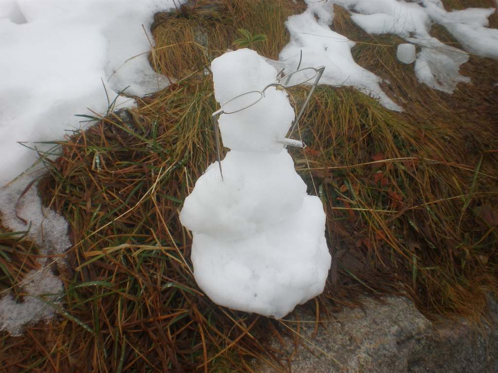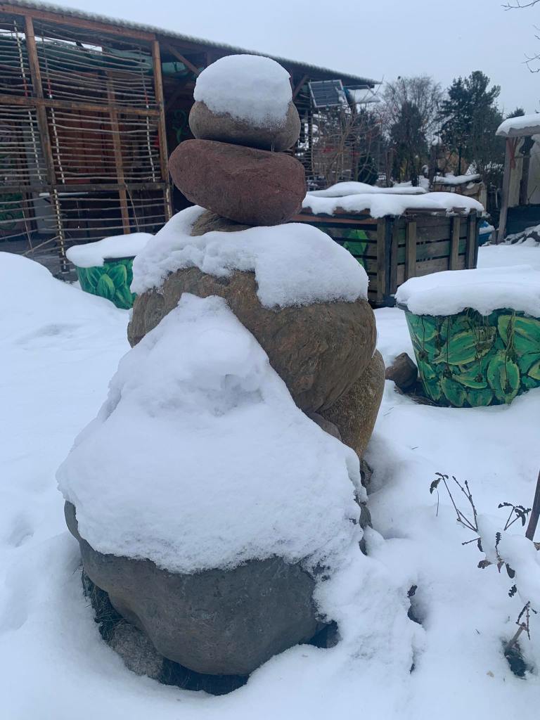 A tu jeszcze jedno zdjęcie od Eli; tym razem Tomek ułożył (kiedyś) piramidę z kamieni, a śnieg samoistnie zrobił bałwana.