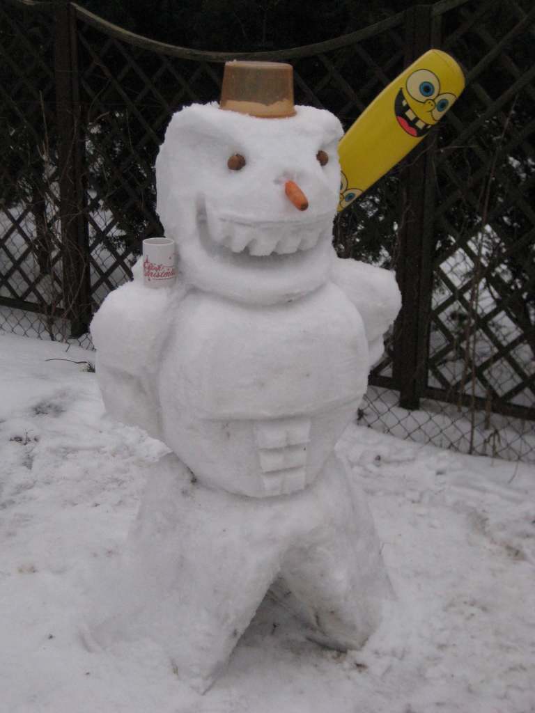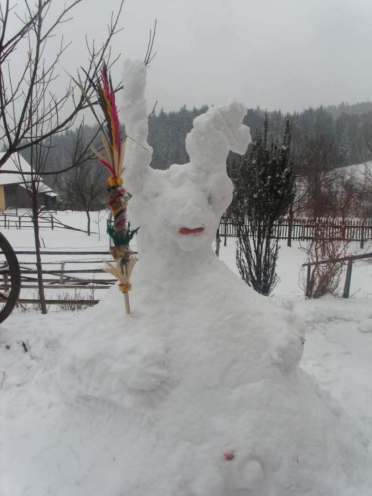 W tamtych zamierzchłych czasach powstał też bardzo wypracowany bałwan Sponge Bob zbudowany w Poznaniu przez Tomka, męża Eli i ich małego wówczas wnuka, tak małego, że bałwan był raczej dziełem Dziadka niż wnuka. W tym roku Dziadek chory, a wnuk już nie robi bałwanów. Ale robił i to jakie – ta gromada malutkich bałwanów to jego dzieło z 2017 roku. Okularnika z papierosem stworzyła Ela – stanął kiedyś na Kasprowym Wierchu, a ten ostatni gromny bałwan, to, każdy widzi, Zając Wielkanocny z czasów, gdy rodzina Eli jeździła na święta do Lachowic, wioski, w moim pojęciu, na Podhalu. Ale co ja tam wiem. Wikipedia podaje, że to powiat suski, województwo małopolskie. Słowo Podhale nie pada.
