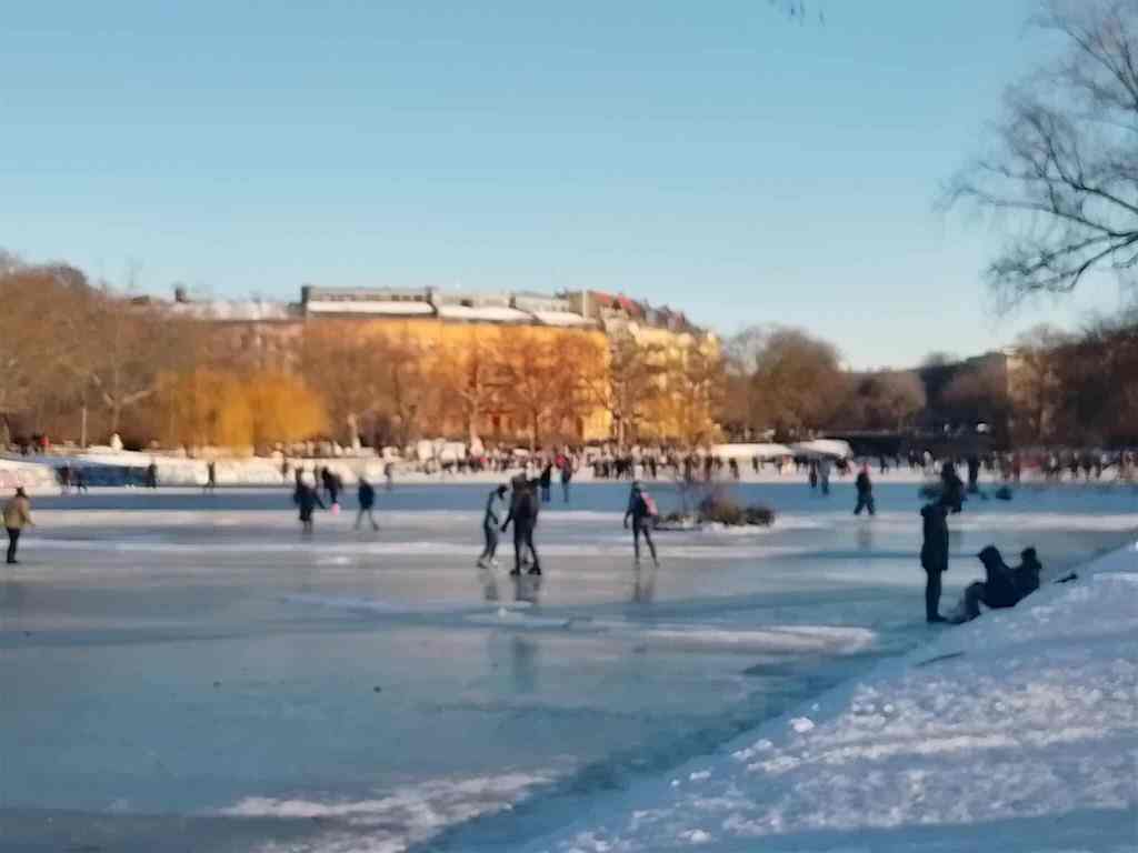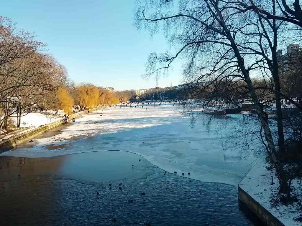 Natomiast Krysia, zamiast lepić bałwany poszła “na lody”. Kanał Landwehry na Kreuzbergu. Policja twierdzi jednak, że lód jest za cienki (na zdjęciu widać, że miejscami go nie ma) i przez całą niedzielę spędzała “ślizgaczy” z lodu.